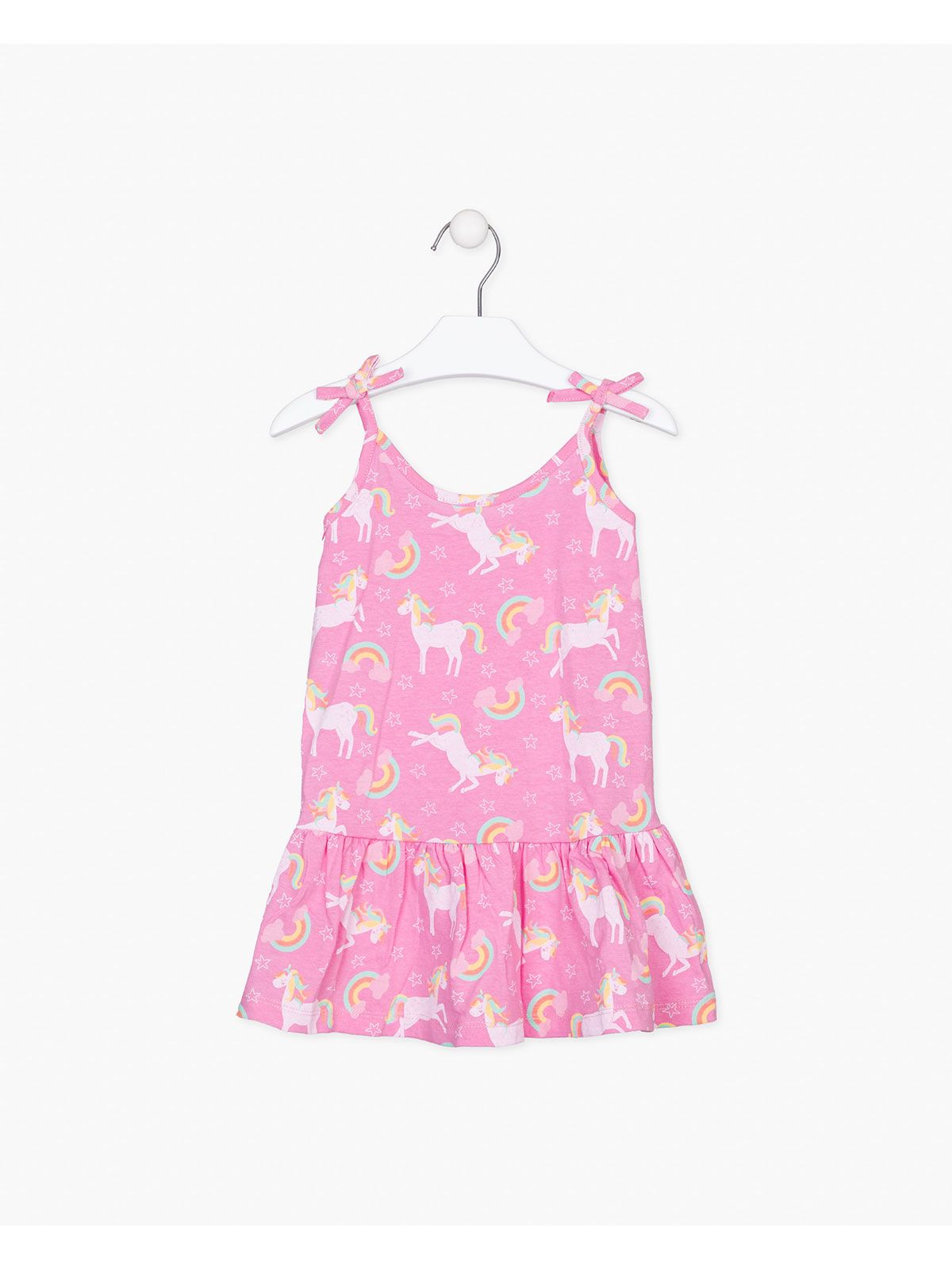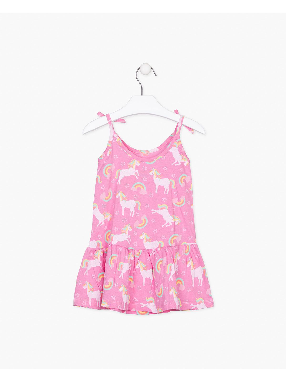 Φόρεμα τιράντα με βολάν και print μονόκεροι ροζ