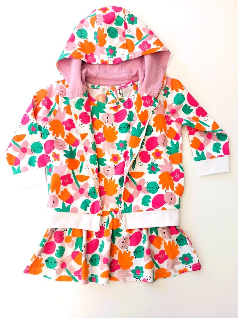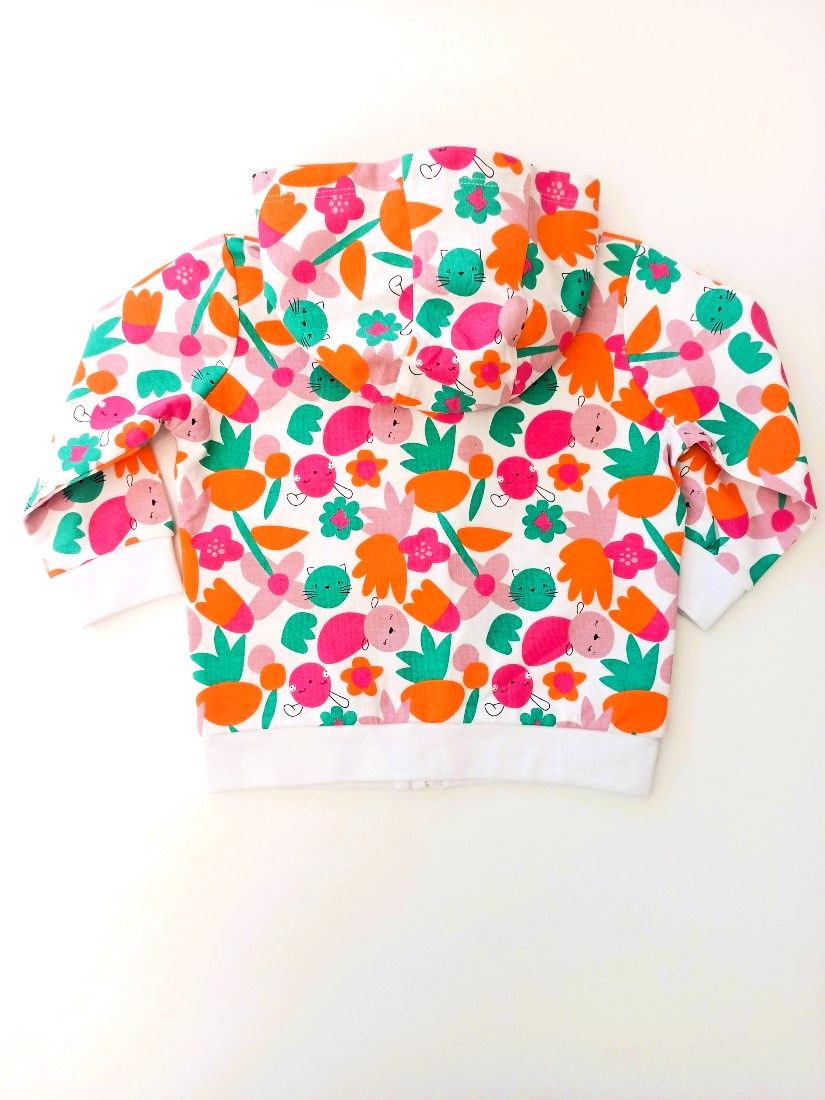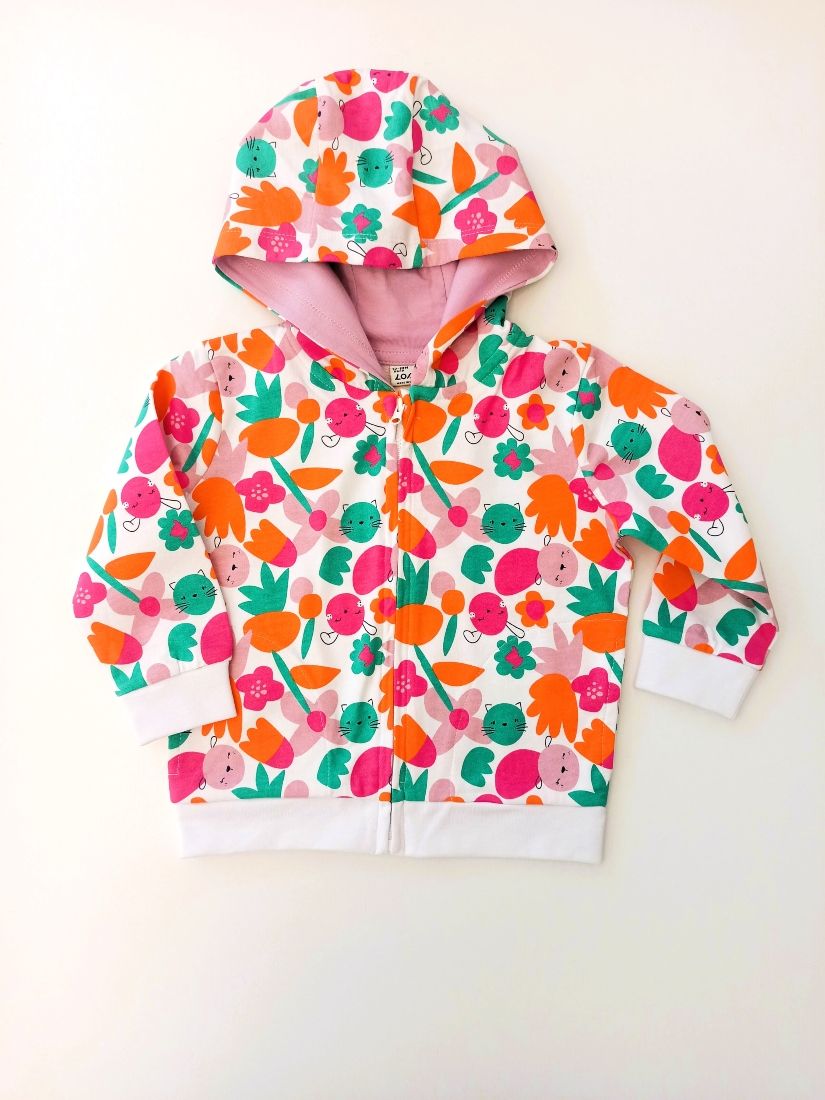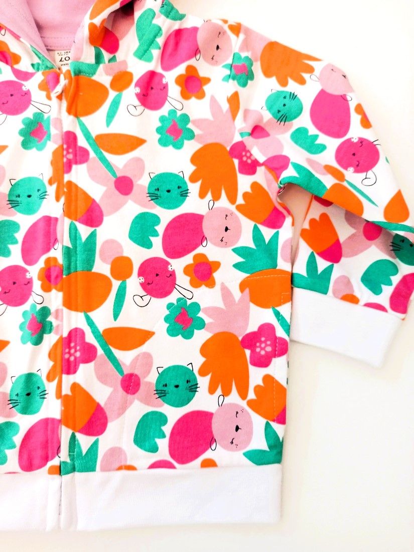 Ζακέτα βρεφική ανοιξιάτικη με εμπριμέ μοτίβο κουκούλα και τσέπες φούξια