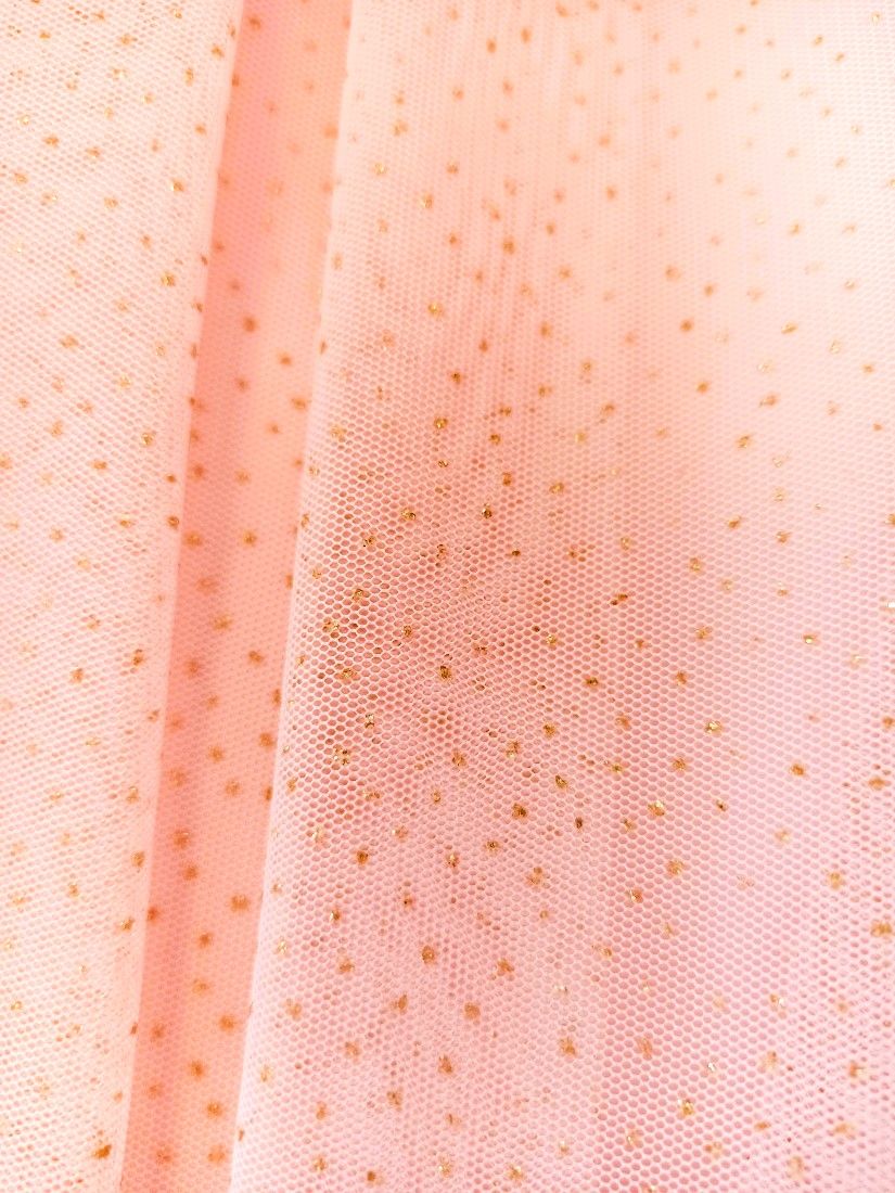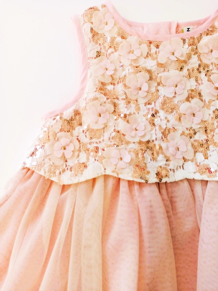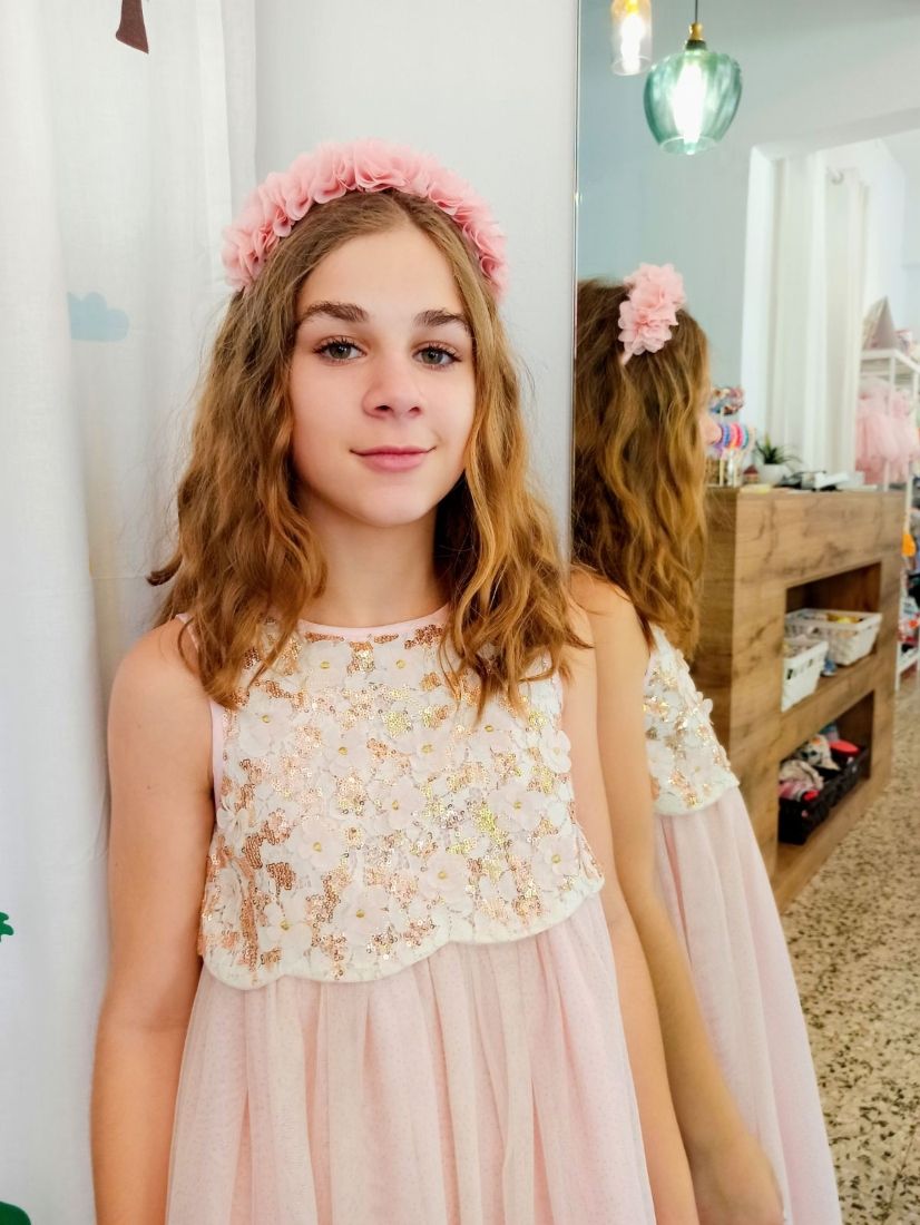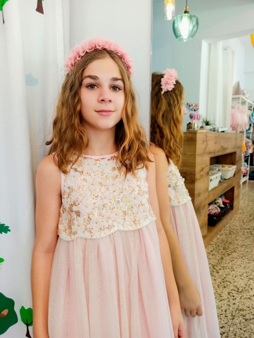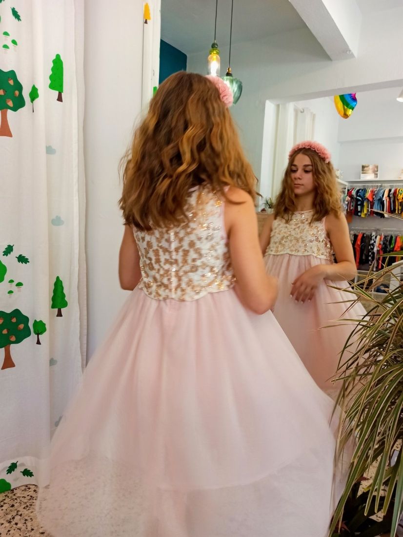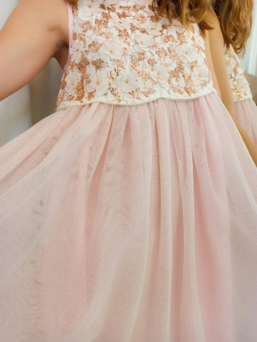 Φόρεμα μακρύ με τούλι στρας και μπούστο παγέτα και κεντημένα λουλούδια ροζ χρυσό