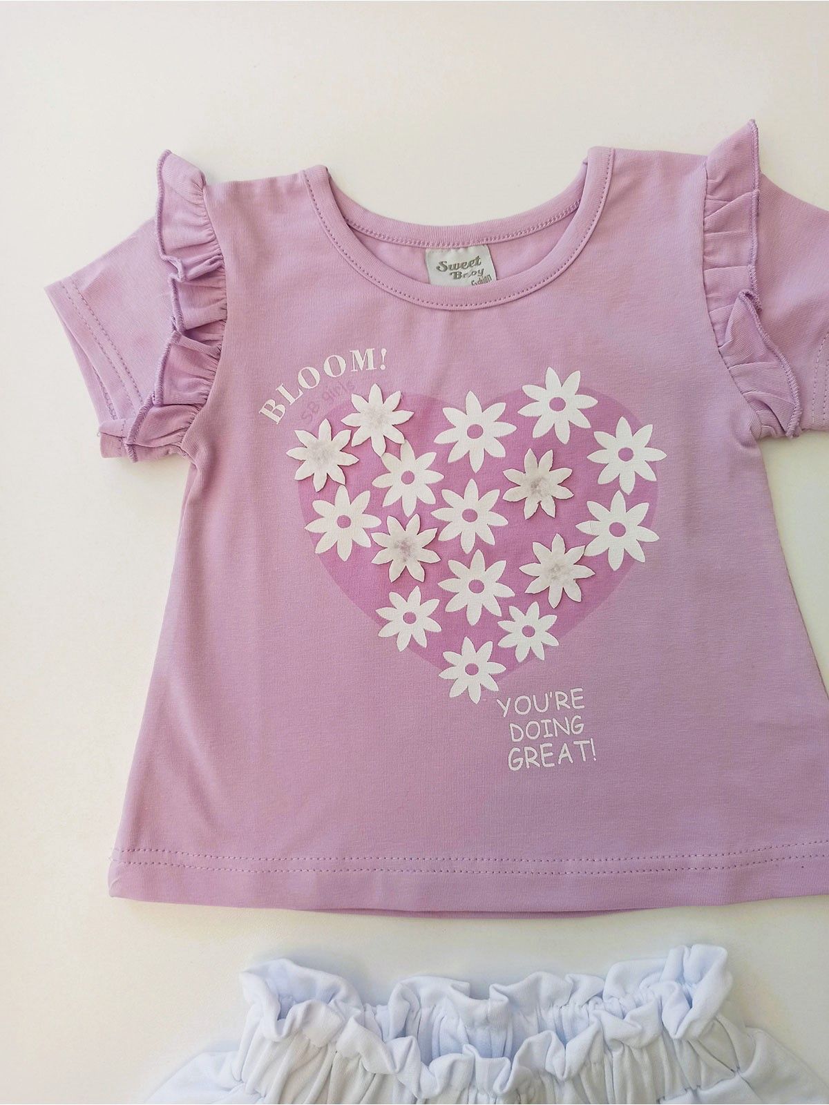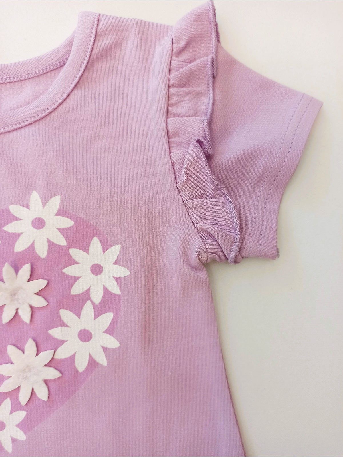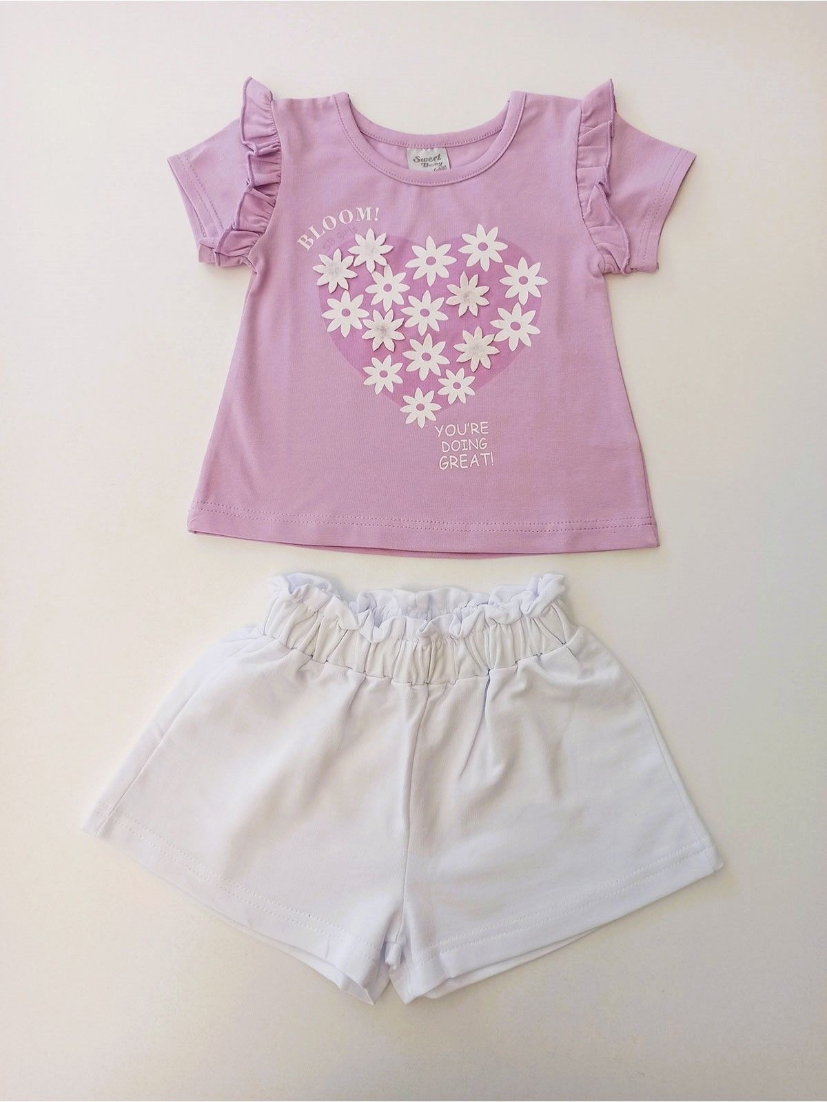 Σετ μπλούζα με βολάν και print 3D μαργαρίτες και σορτς με λάστιχο ελληνικής ραφής λιλά