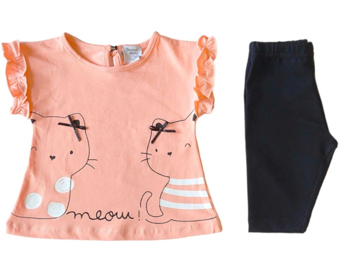 Σετ μπλούζα με print γατούλες και κολάν κάπρι ελληνικής ραφής ροζ