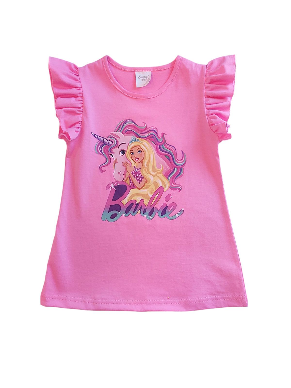 Φόρεμα βαμβακερό με τύπωμα και βολάν στο μανίκι ελληνικής ραφής ροζ
