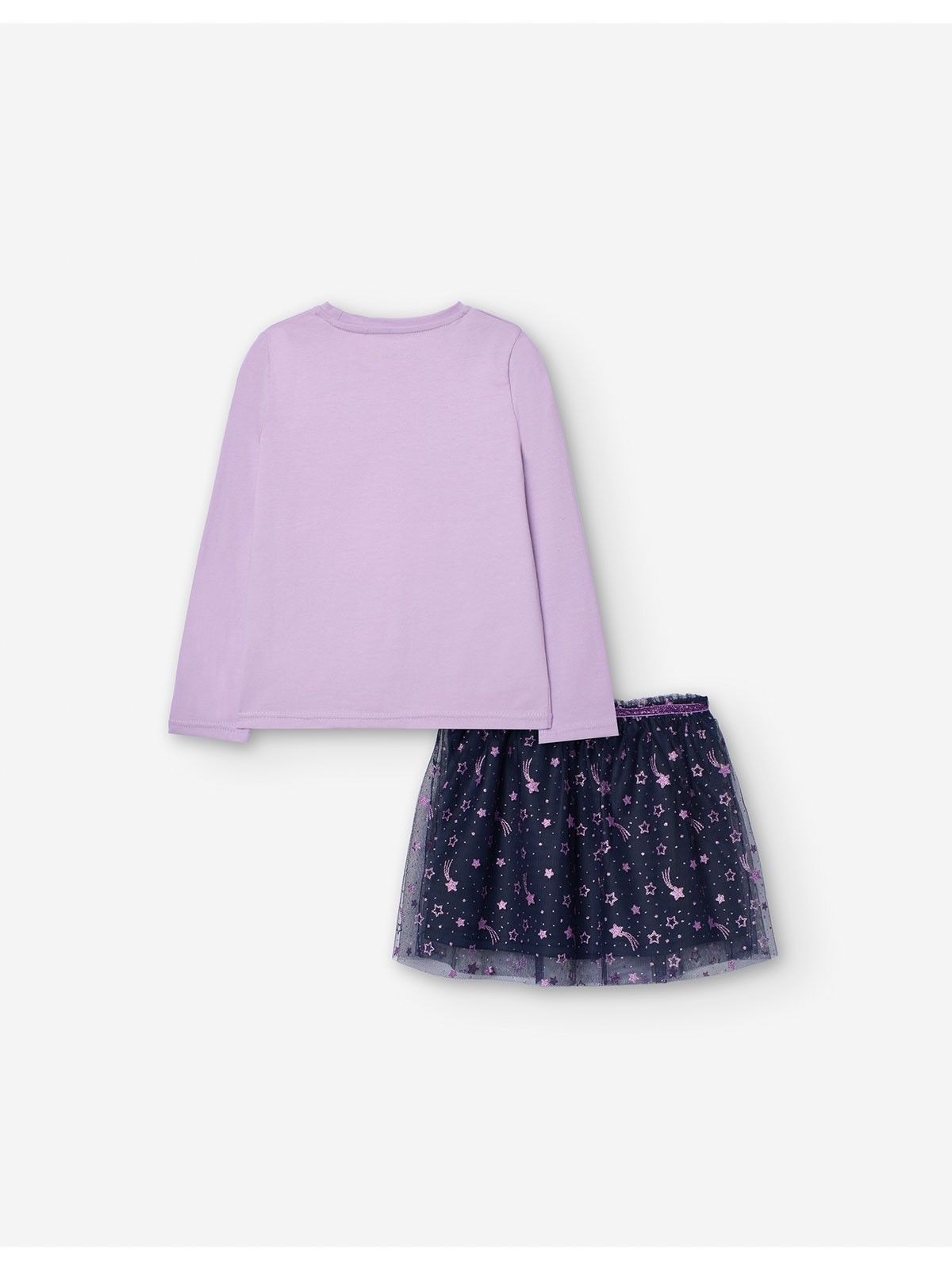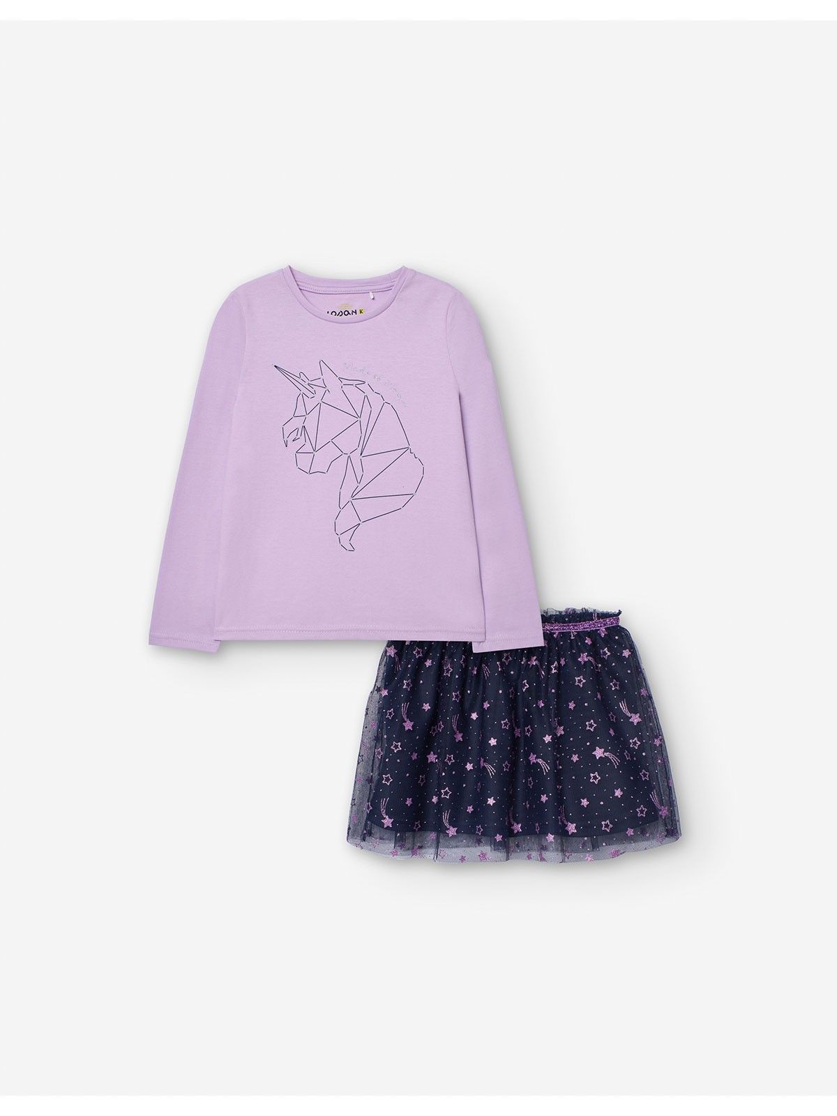 Σετ βαμβακερό τοπ με print unicorn και τούλινι φούστα με αστέρια με glitter λιλά