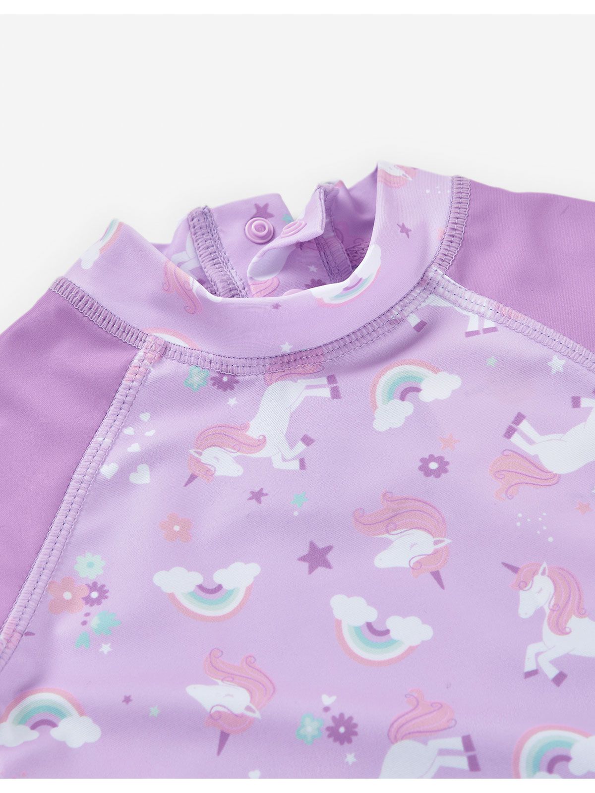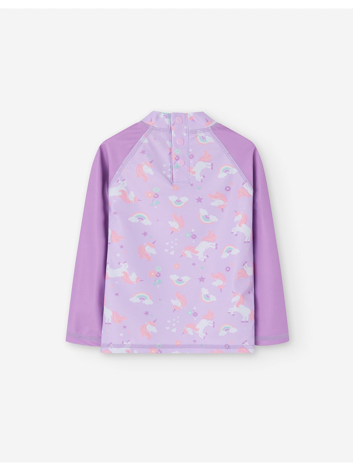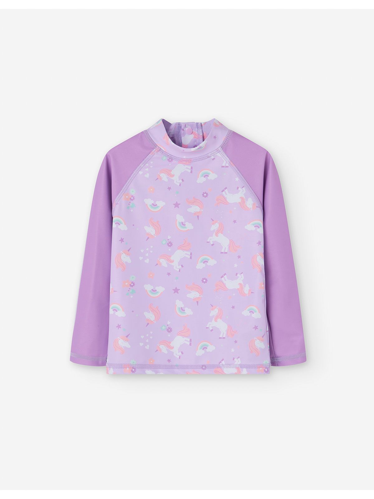 Αντηλιακή μπλούζα μαγιό με SPF 40+ με print μονόκερους και ουράνια τόξα λιλά