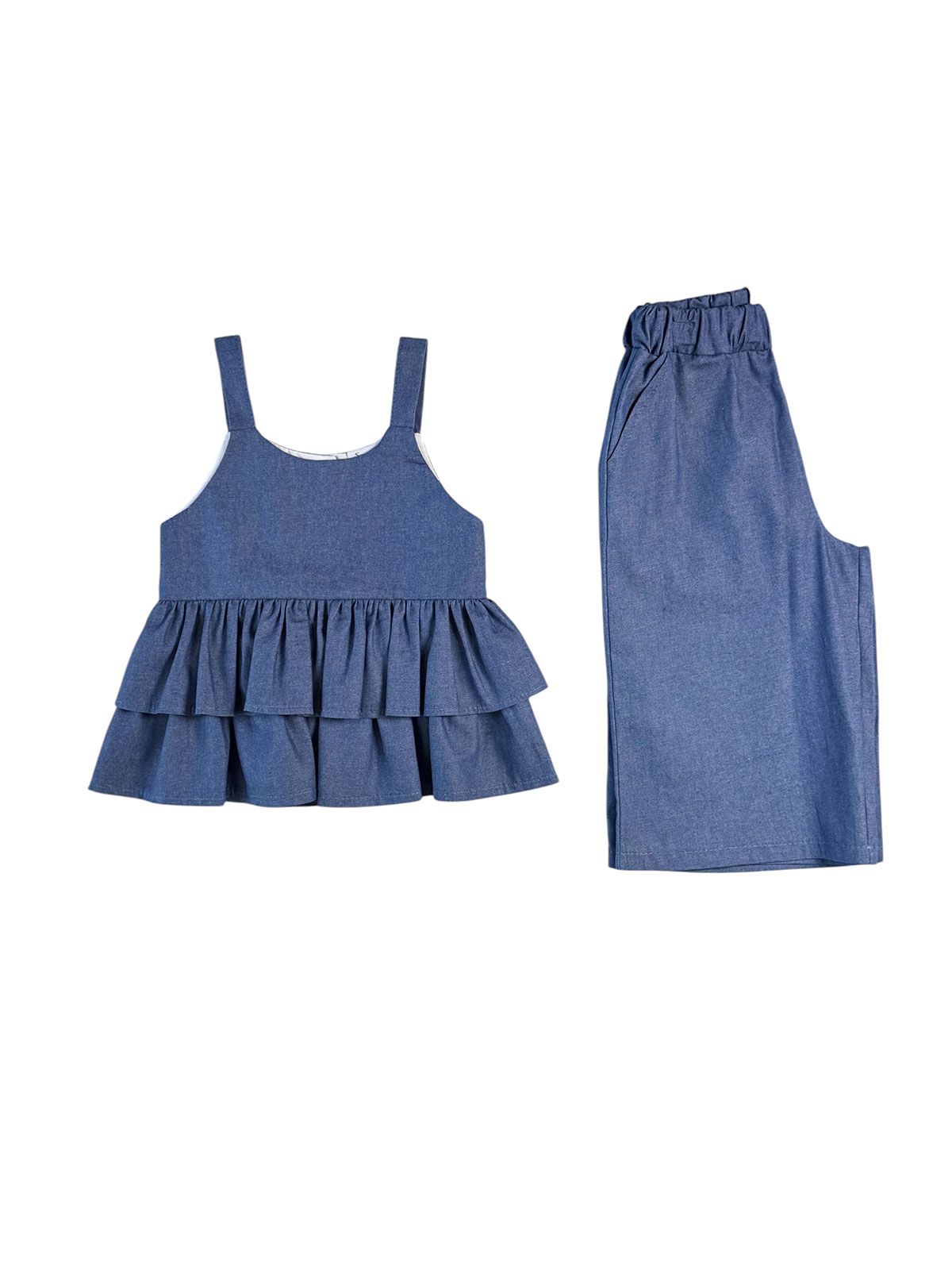Σετ τζιν τοπ με βολάν και παντελόνα με λάστιχο ελληνικής ραφής κορίτσι μεγάλο μπλε