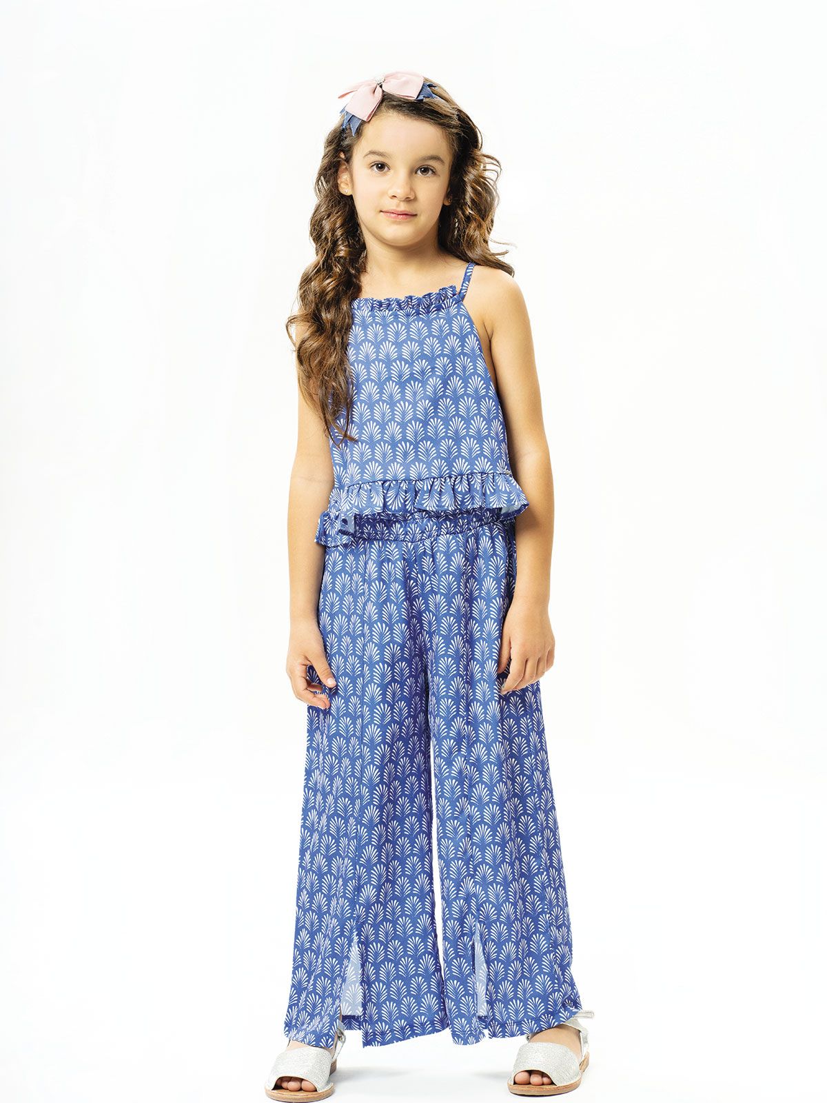 Σετ εμπριμέ κροπ τοπ με βολάν και παντελόνα με ανοίγματα μπλε