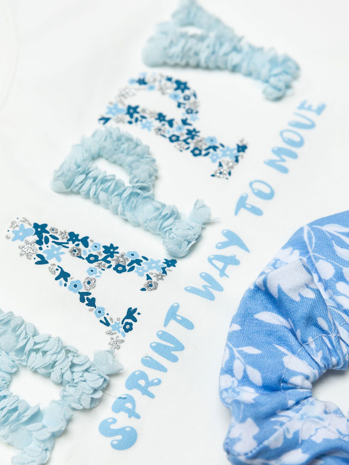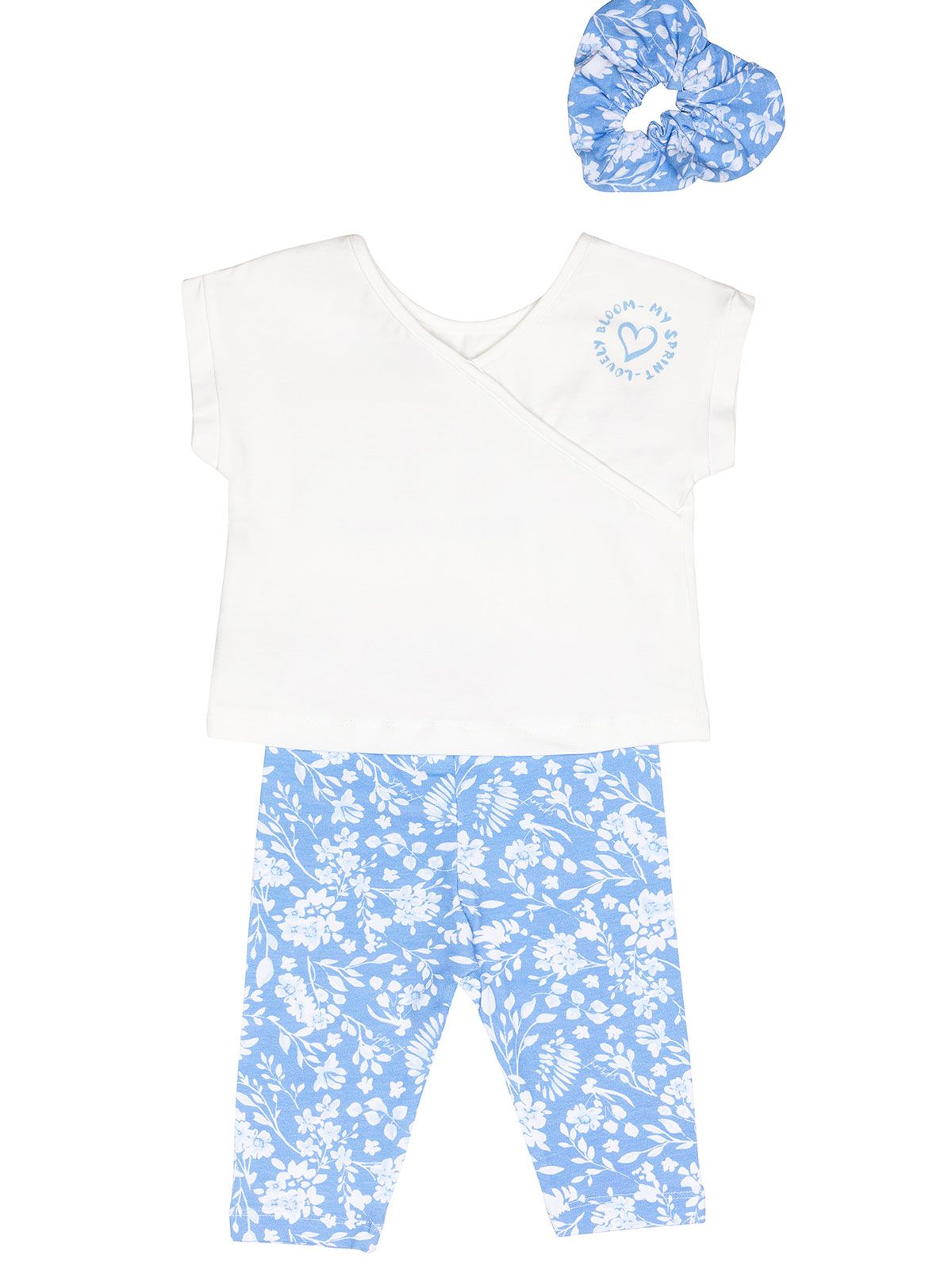 Σετ τοπ με print Happy με λουλούδια και φλοράλ κάπρι κολάν και δώρο Scrunchy γαλάζιο