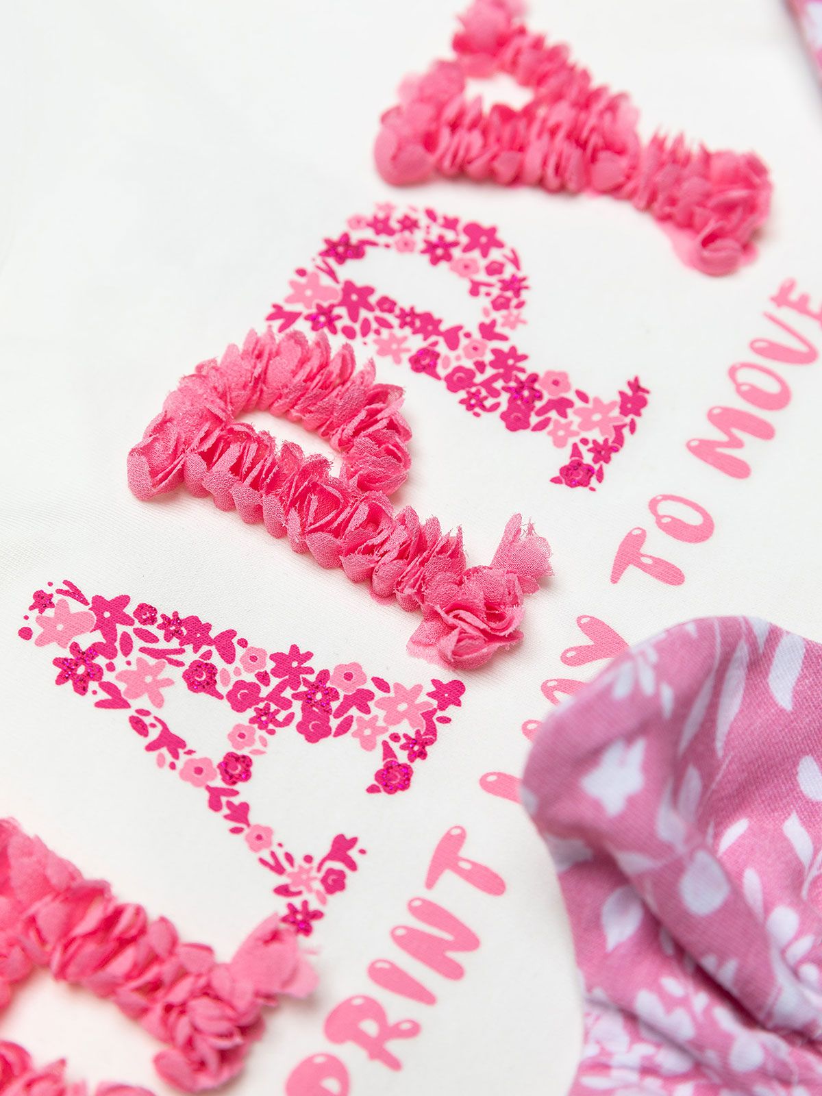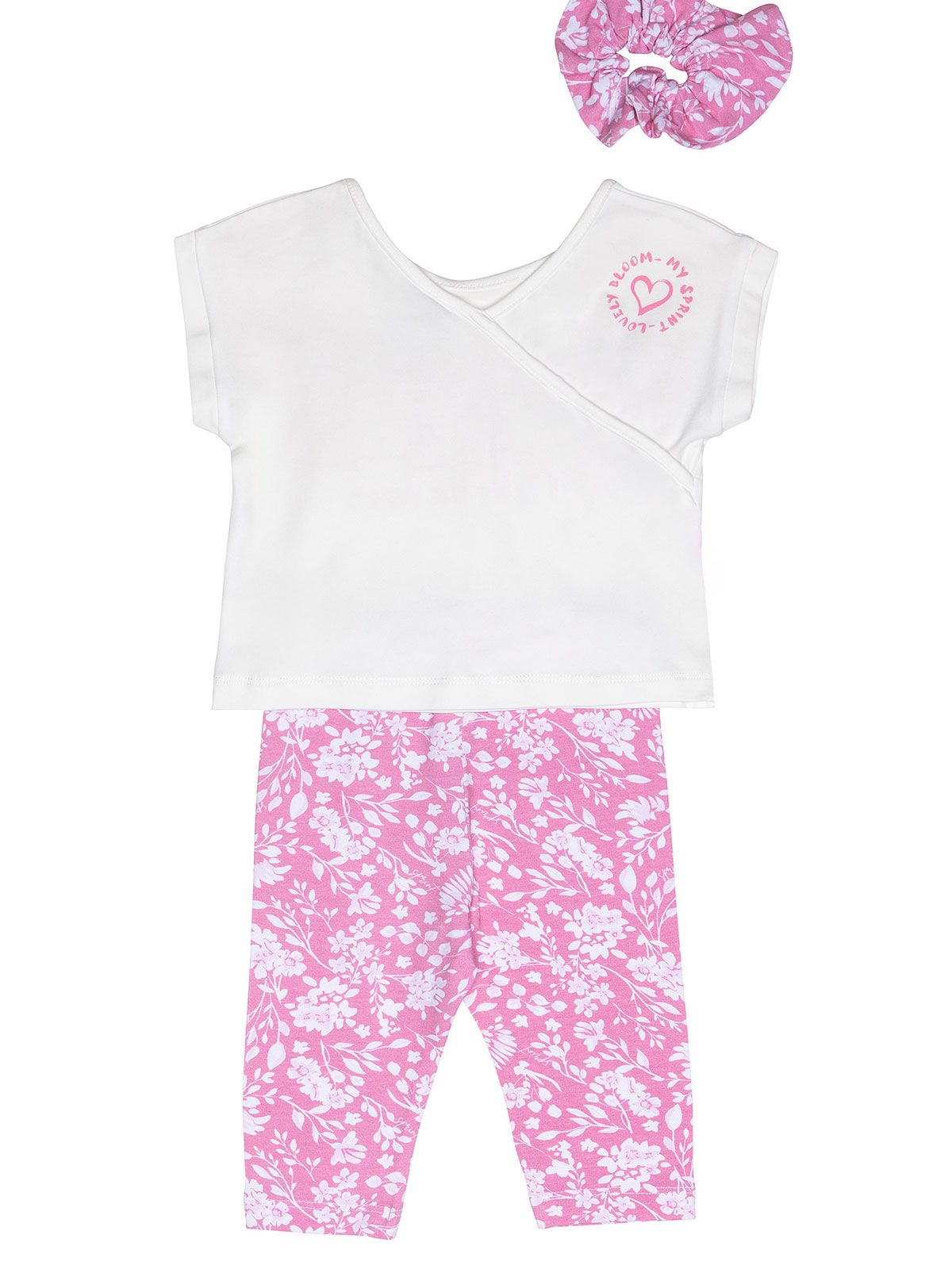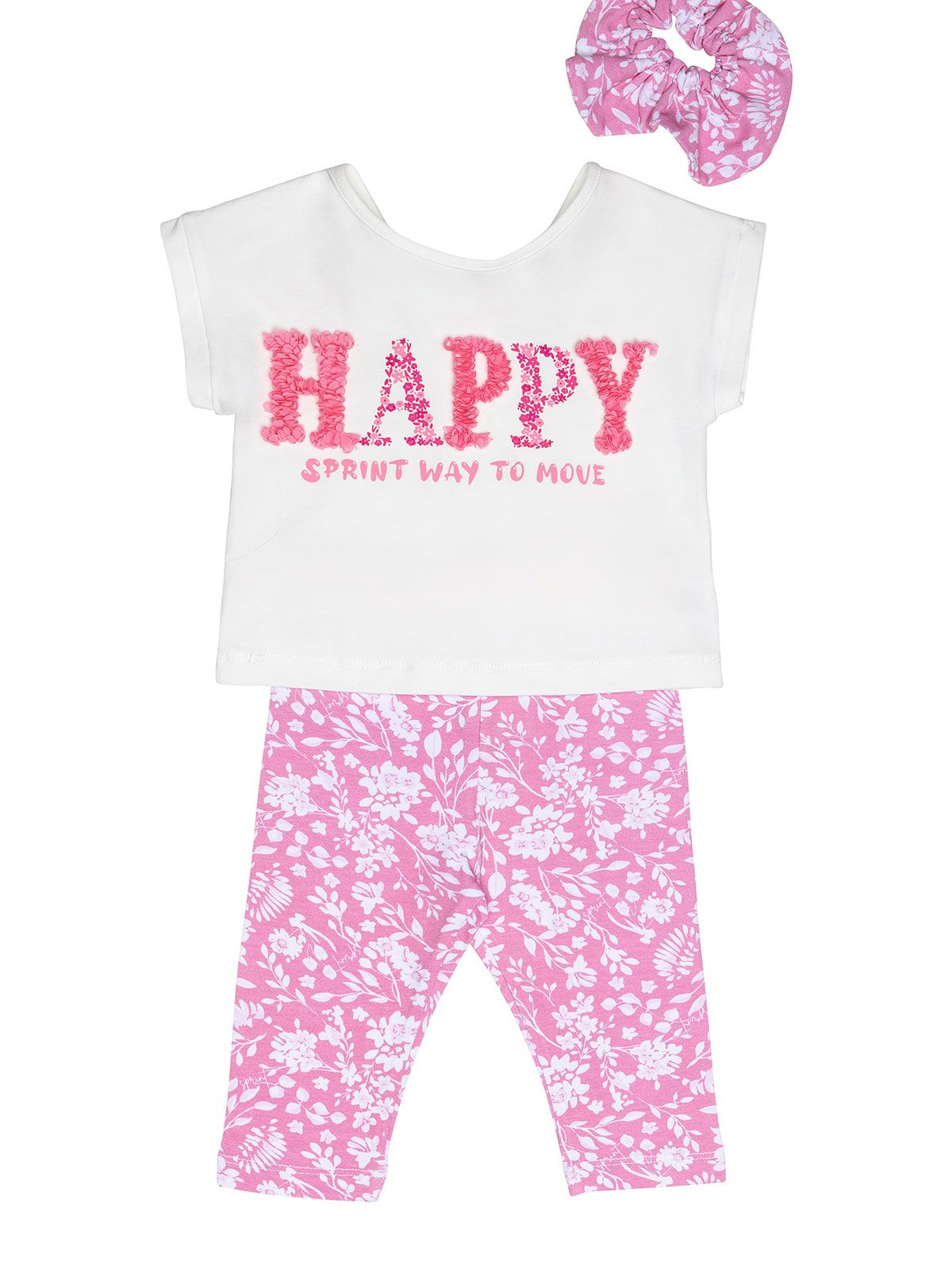 Σετ τοπ με print Happy με λουλούδια και φλοράλ κάπρι κολάν και δώρο Scrunchy ροζ