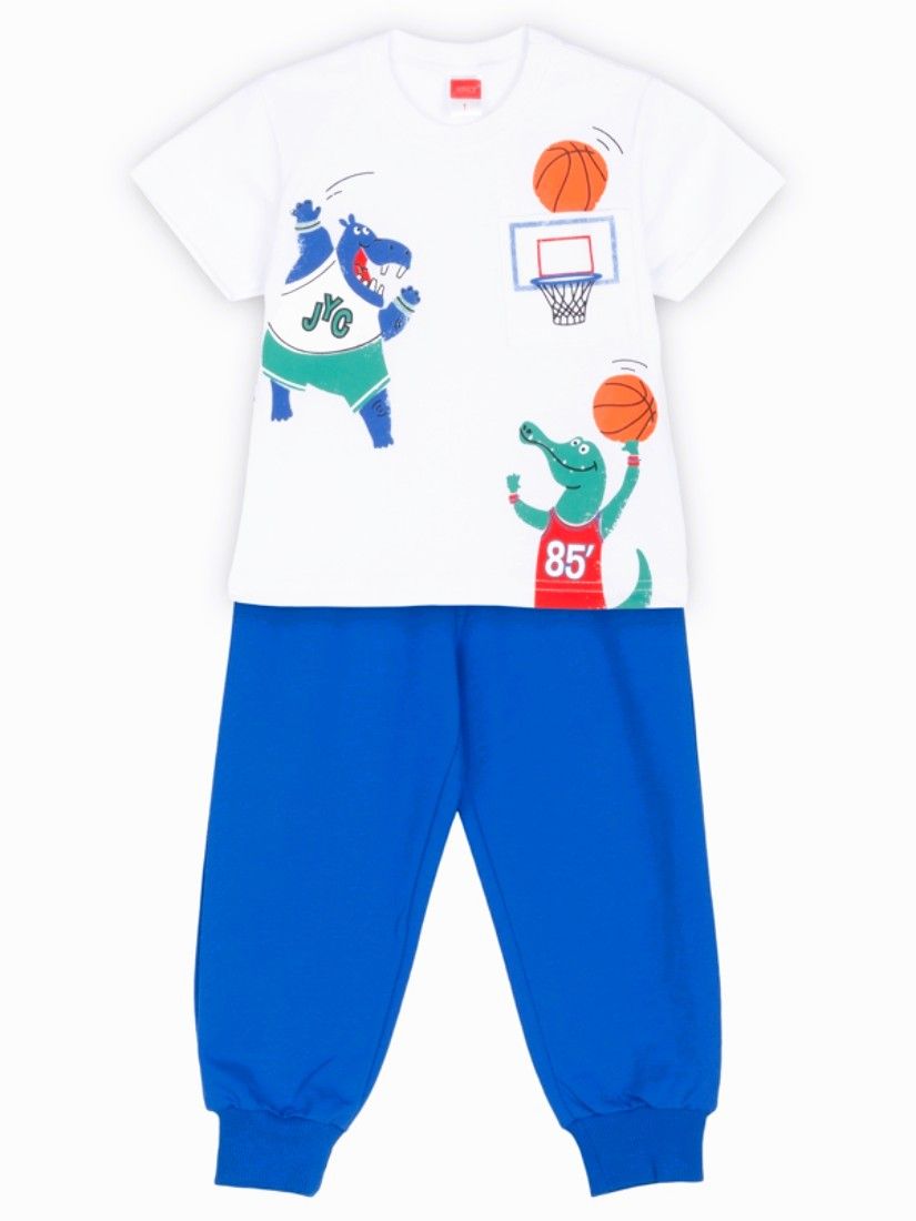 Σετ εποχιακό κοντομάνικη μπλούζα με τσέπη και μονόχρωμο παντελόνι μπλε ρουά