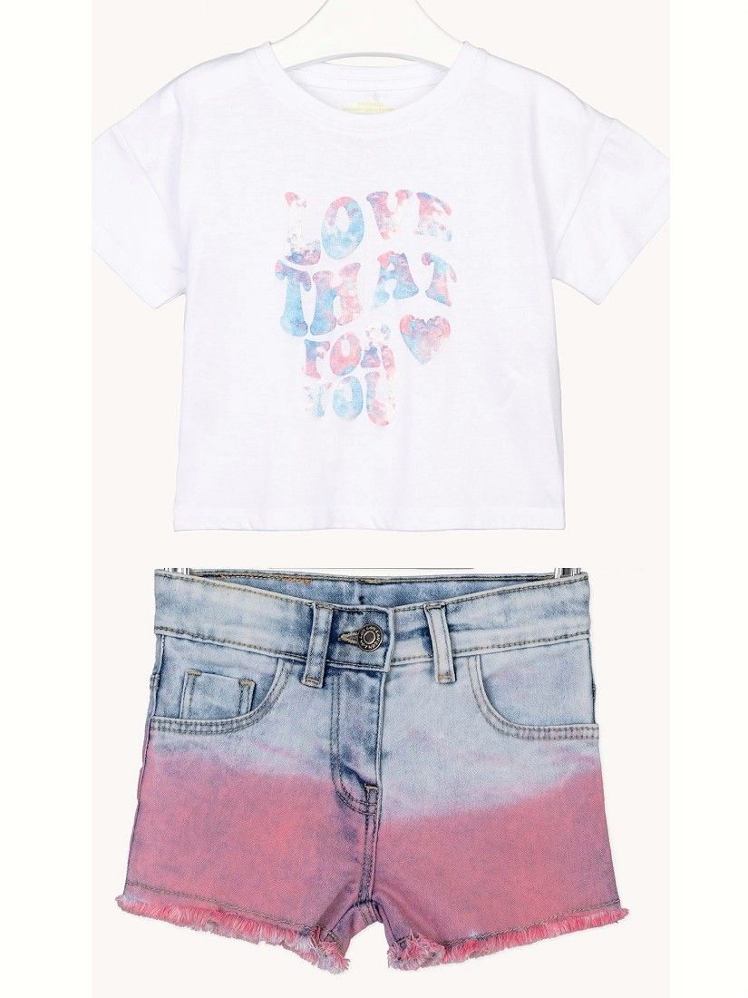 Σετ μπλούζα με print love και τζιν όμπρε σορτς ροζ