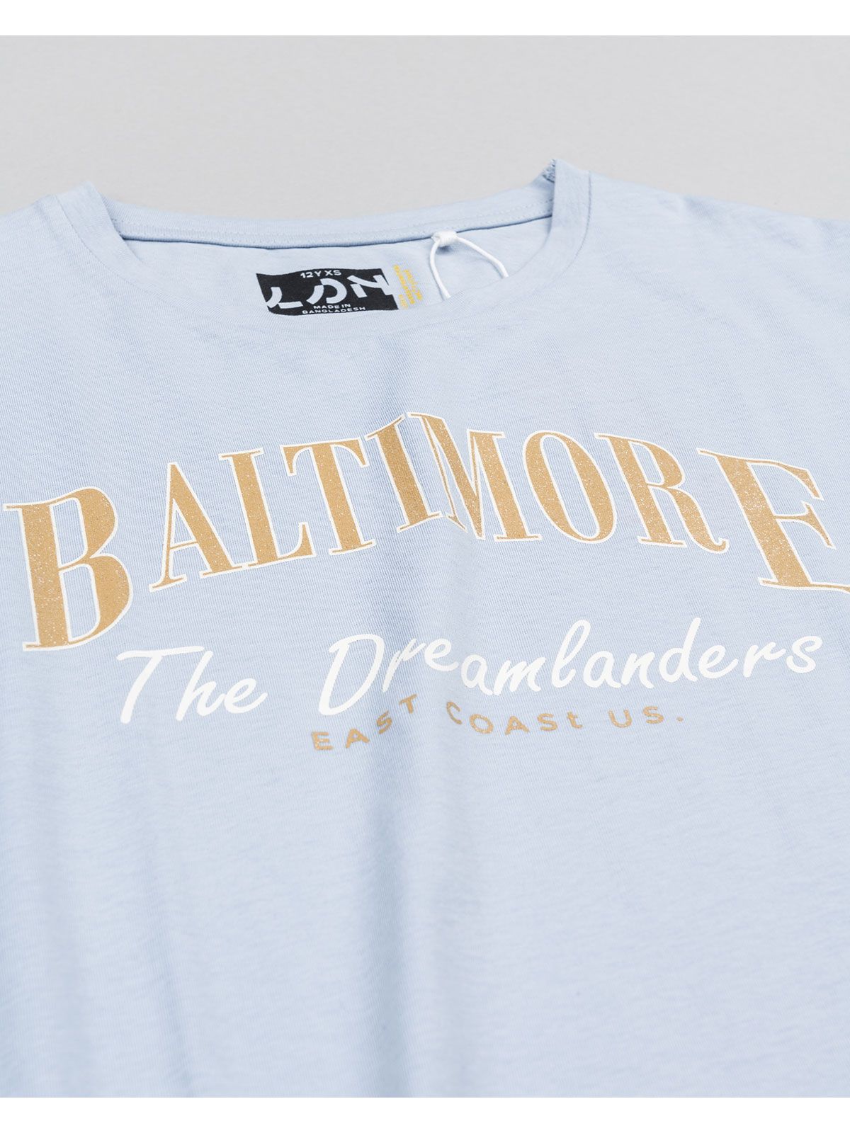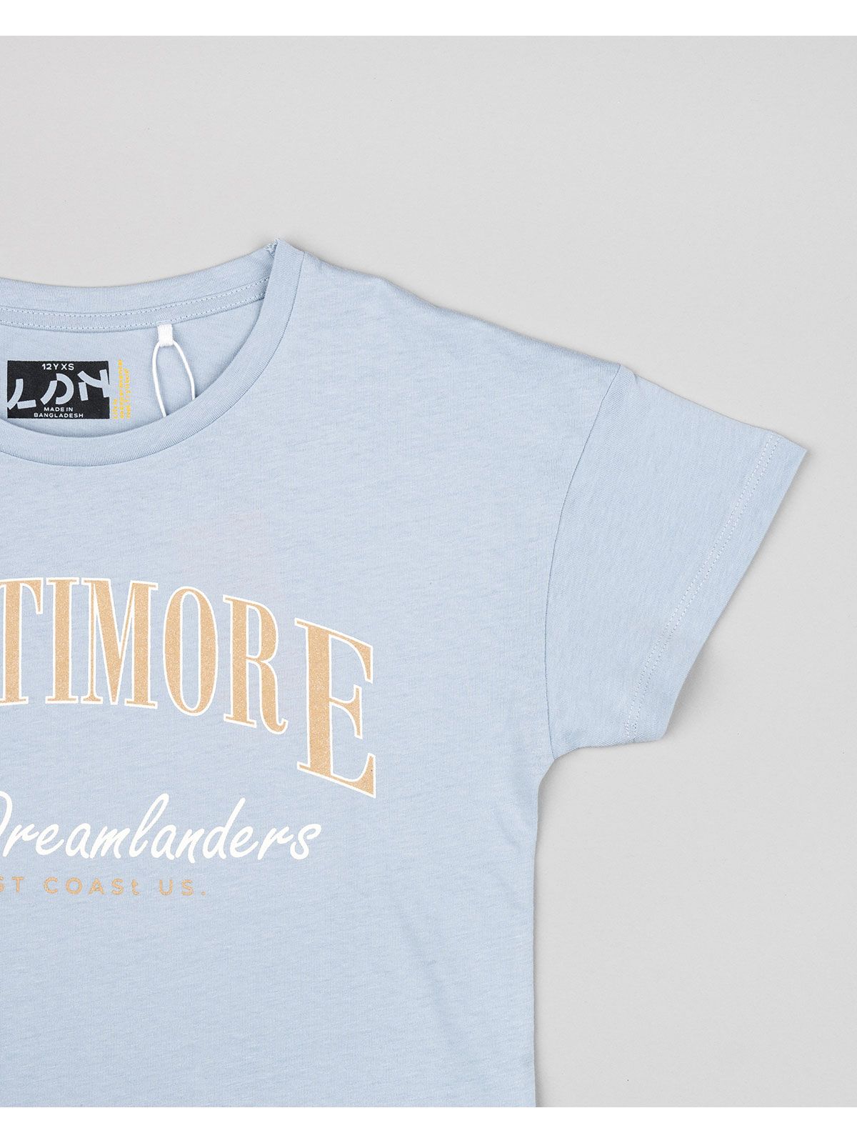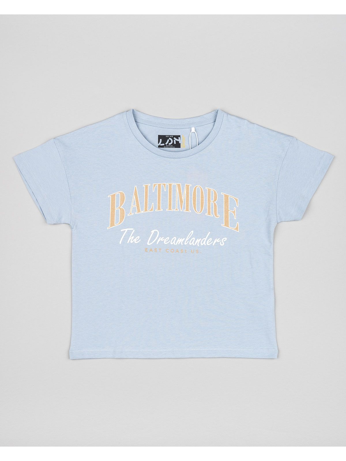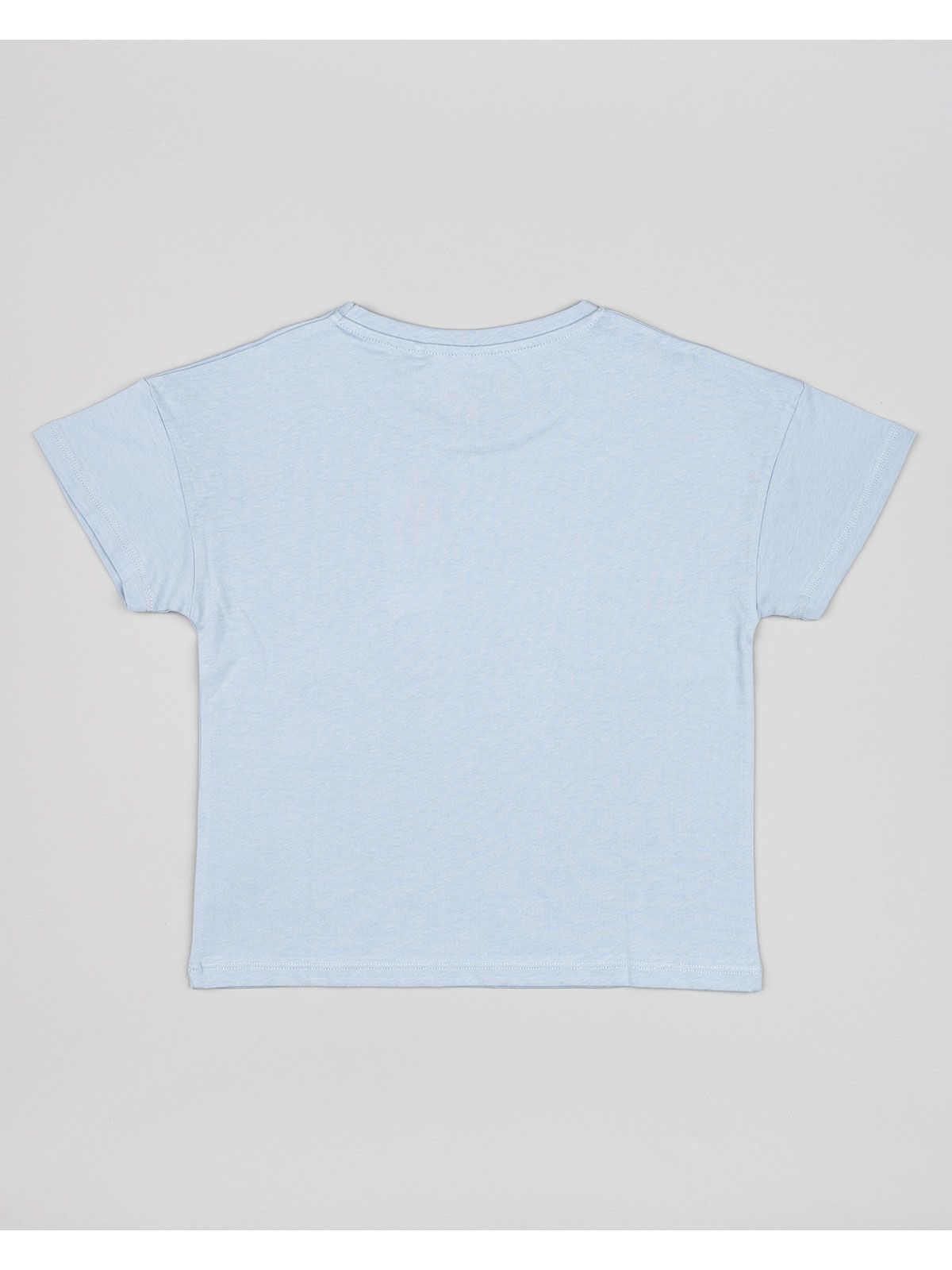 Μπλούζα κοντομάνικη κροπ βαμβακερή με διάφορα print γαλάζιο