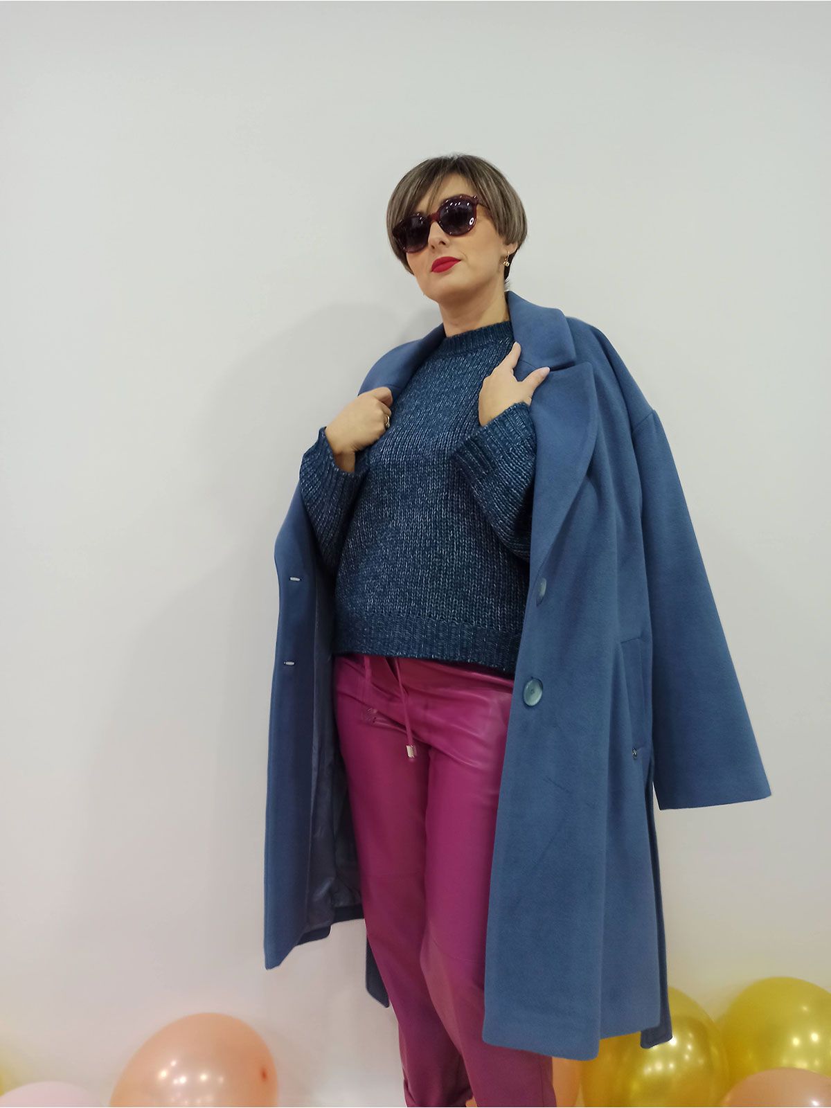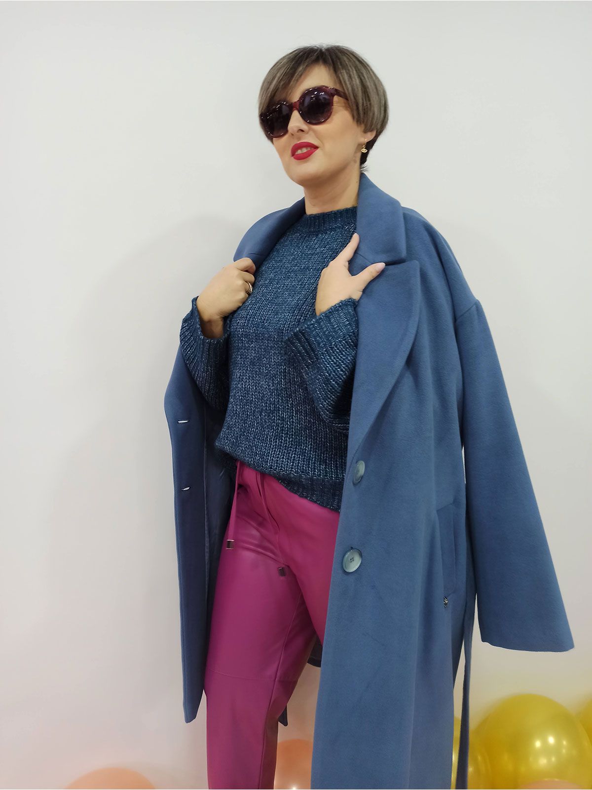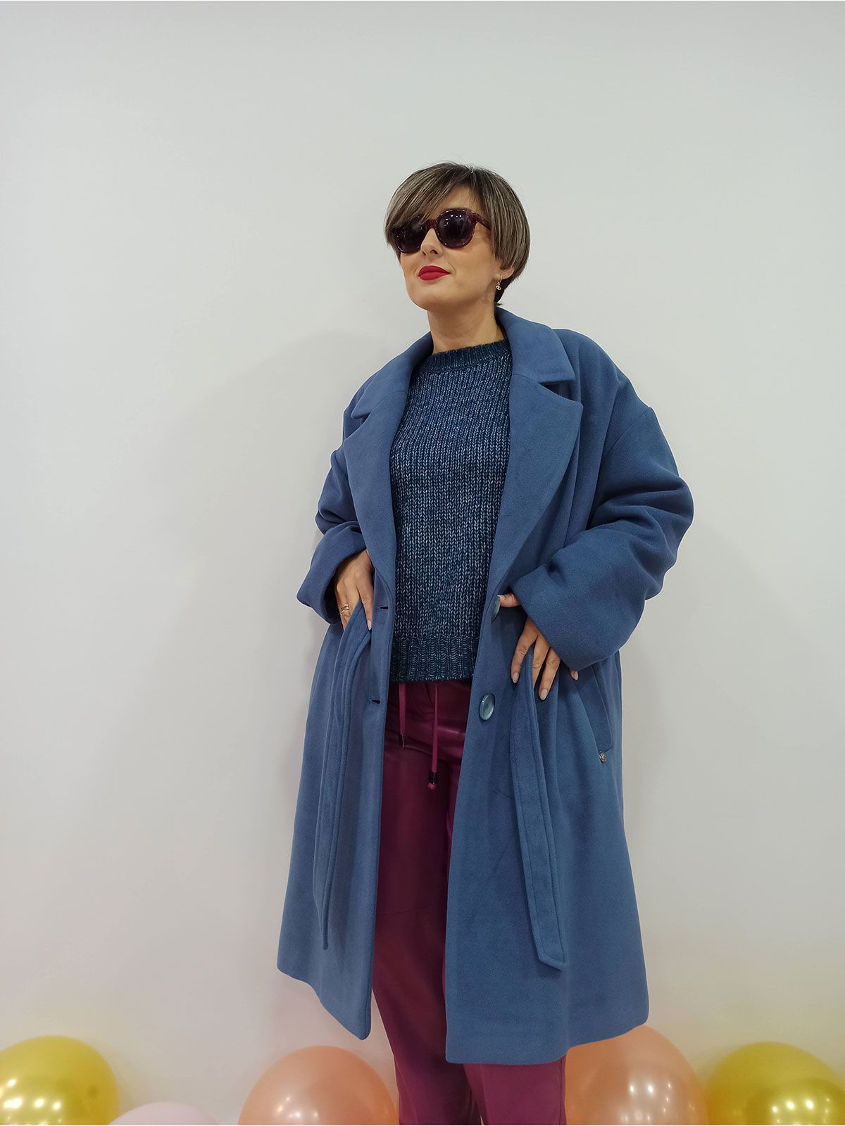 Παλτό μονόχρωμο ελληνικής ραφής με κουμπιά και ζώνη γαλάζιο