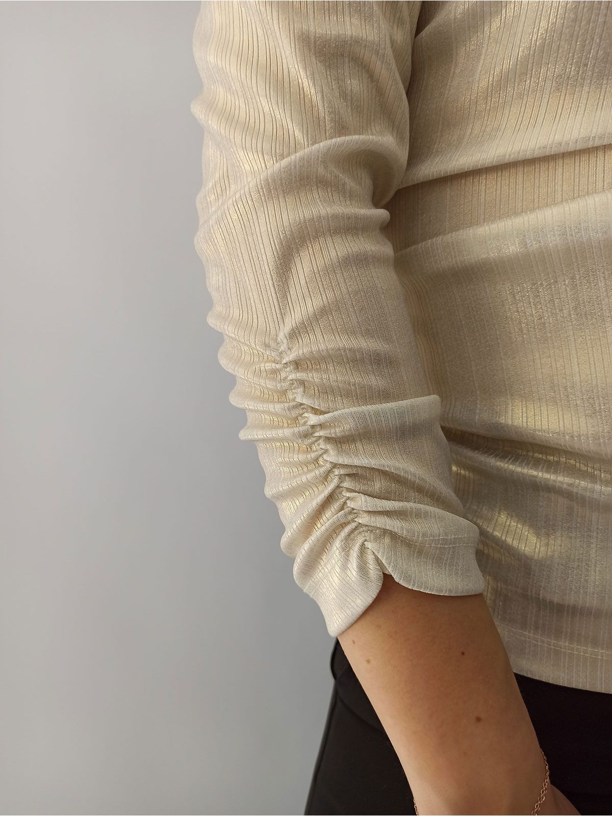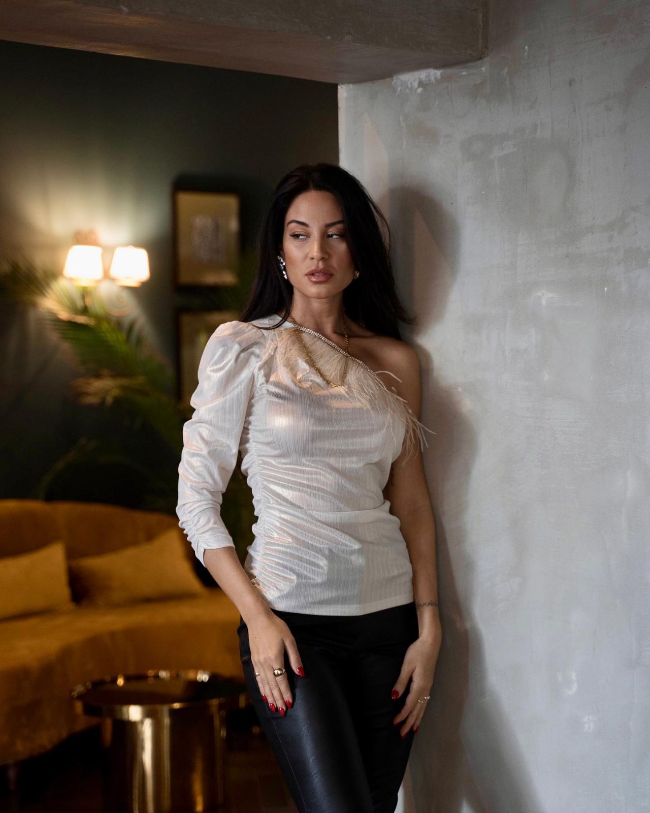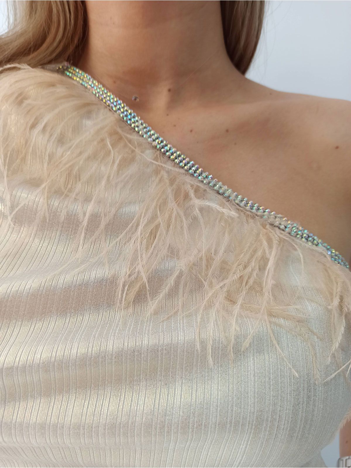 Μπλούζα με ένα μανίκι στρας και φτερά μπροστά ελληνικής ραφής εκρού