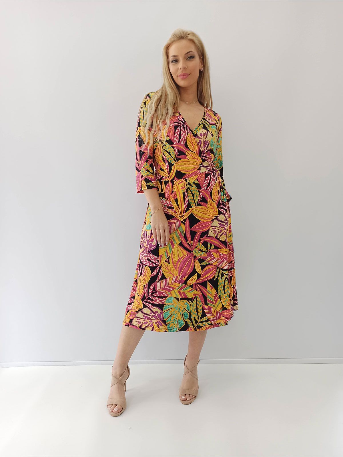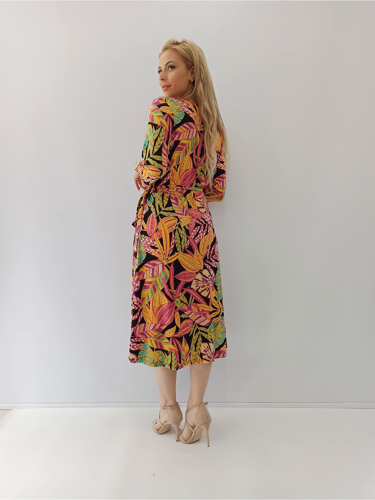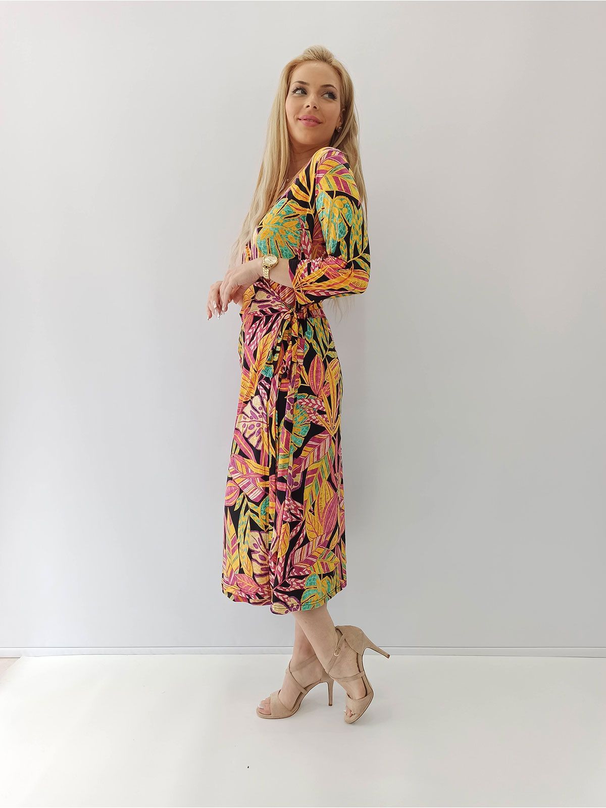 Φόρεμα φλοράλ με τρουακάρ μανίκι και δέσιμο ελληνικής ραφής φούξια