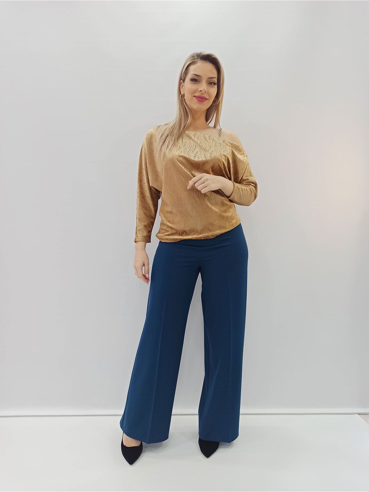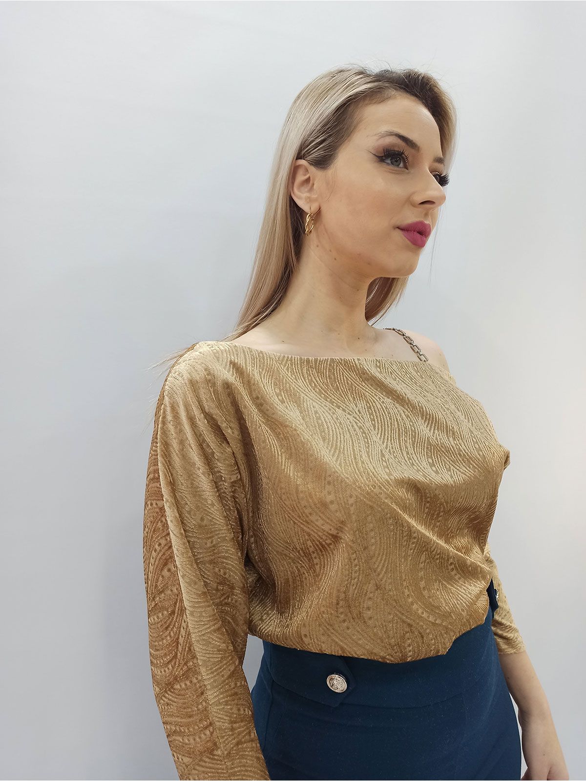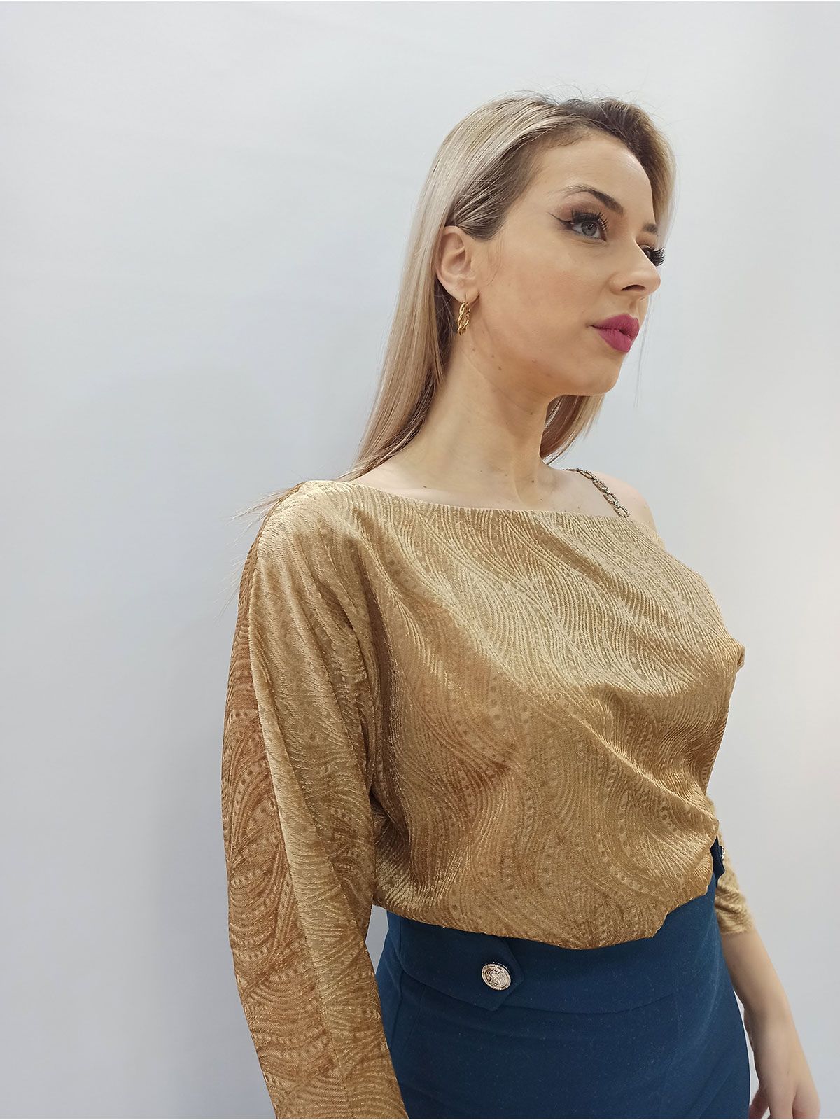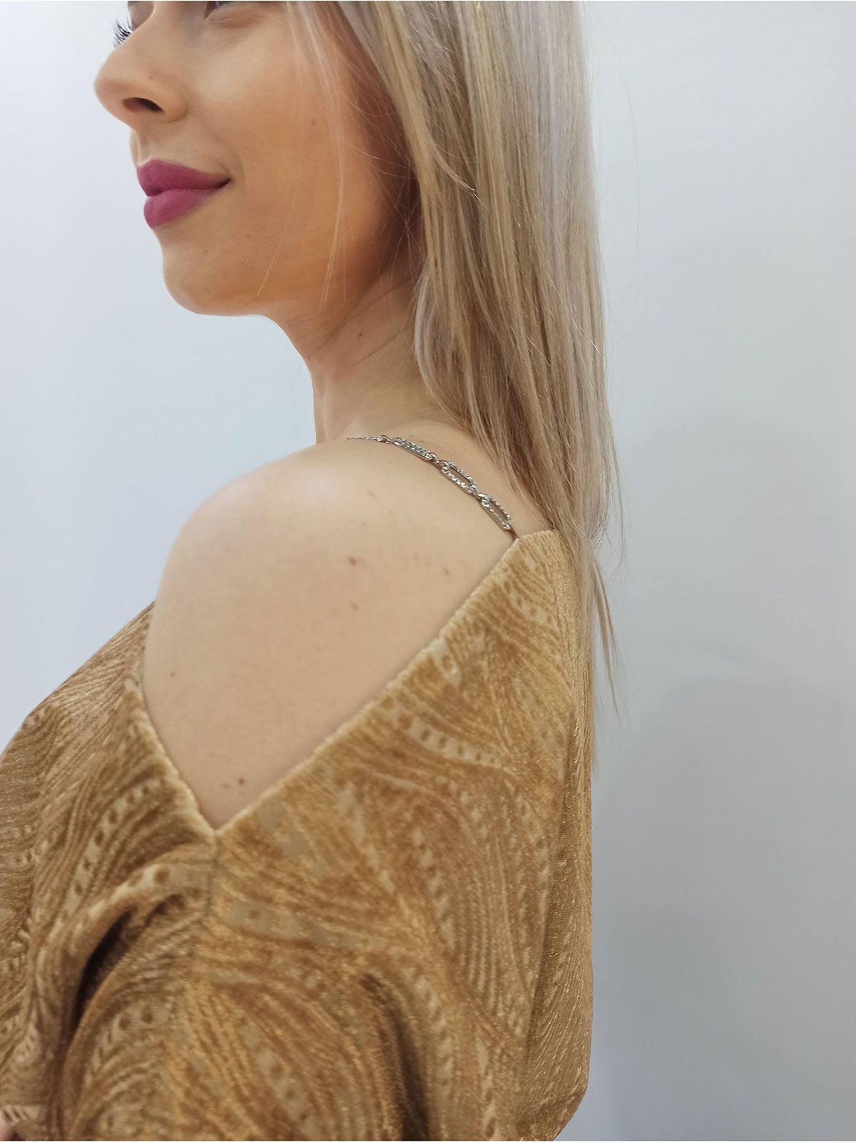 Μπλούζα με ανάγλυφες βελούδινες λεπτομέρειες και αλυσίδα στον ώμο ελληνικής ραφής μπεζ