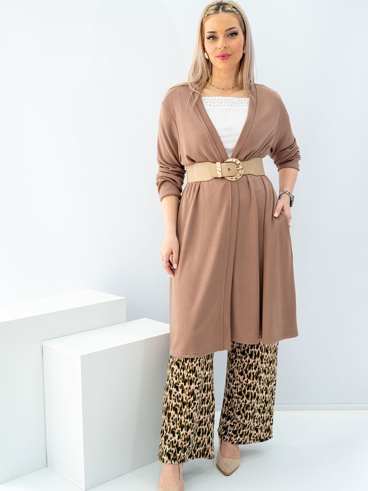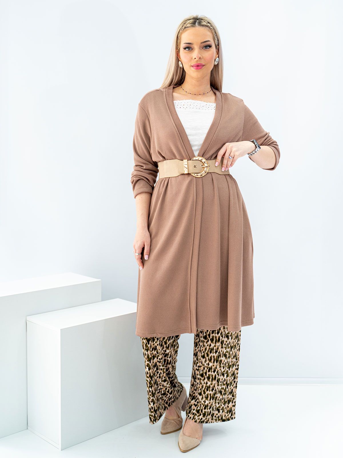 Ζακέτα πλεχτή μακριά με τσέπες στο πλάϊ και A γραμμή σοκολά