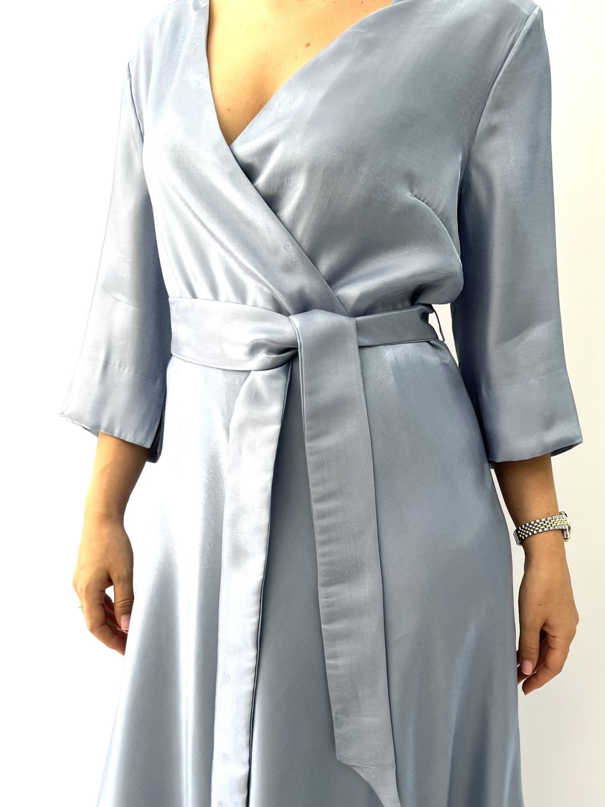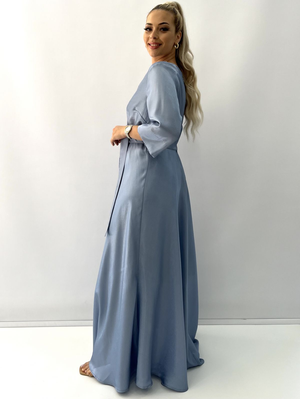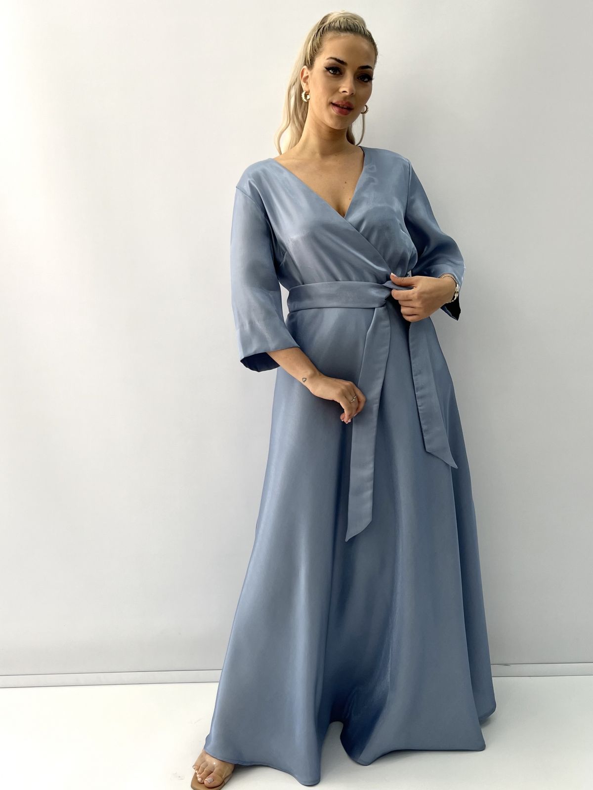 Φόρεμα μακρύ κρυσταλιζέ κρουαζέ με τρουακάρ μανίκι και ζώνη Ελληνικης ραφής σιέλ