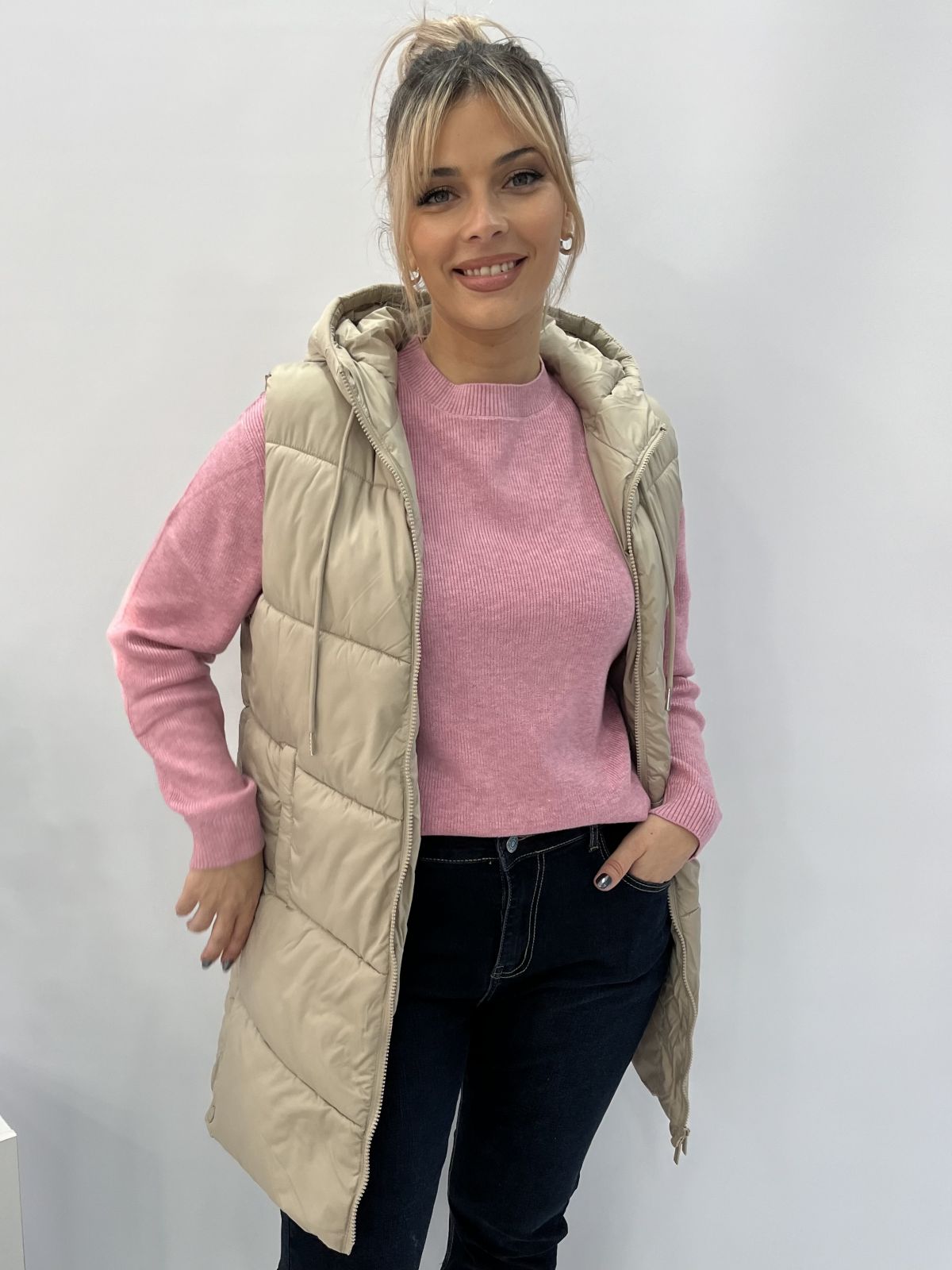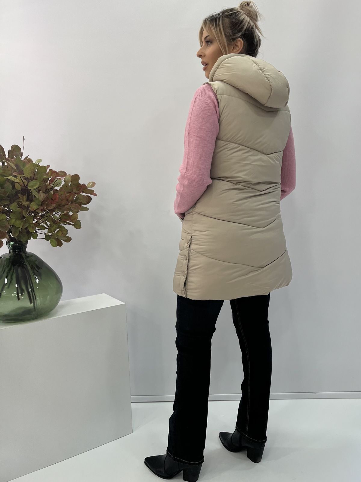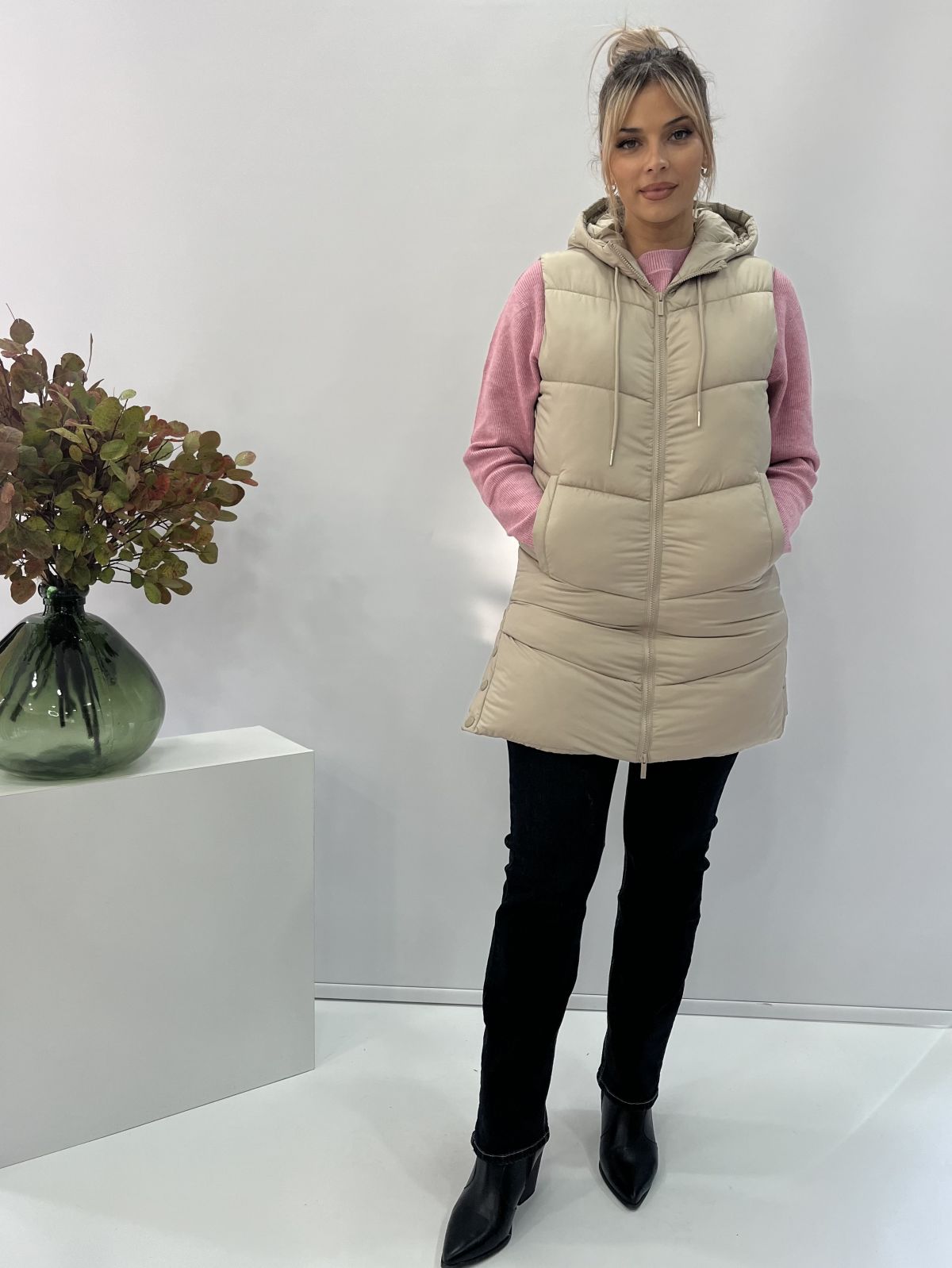 Μπουφάν γιλέκο μακρύ με κουκούλα μονόχρωμο μπεζ
