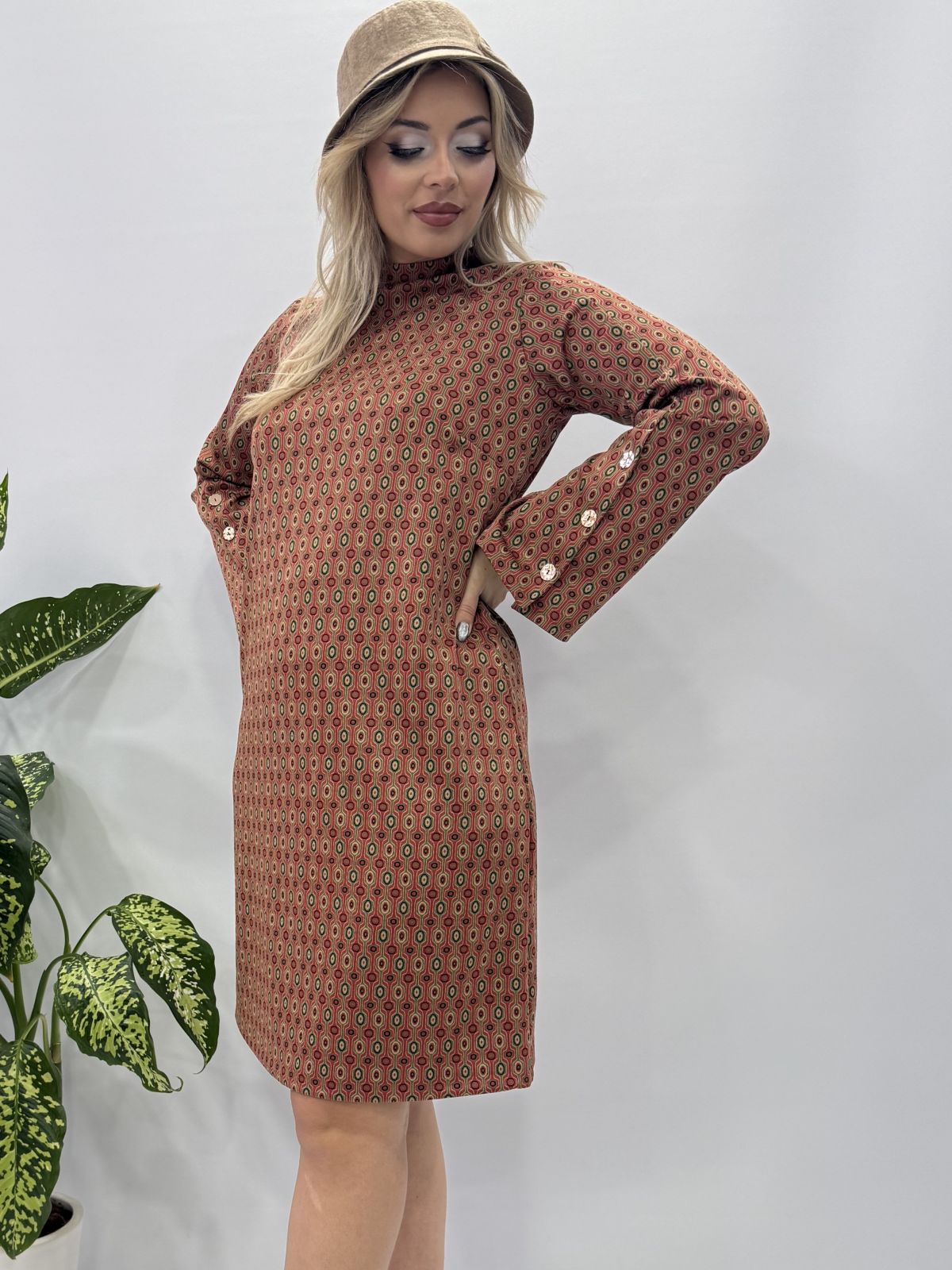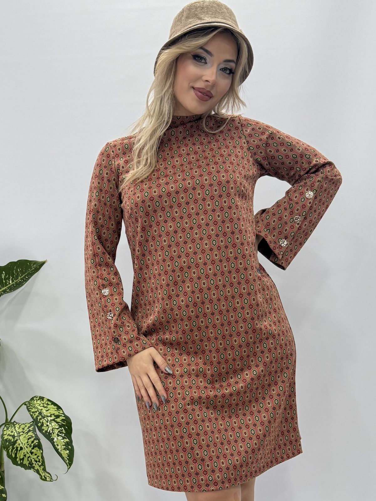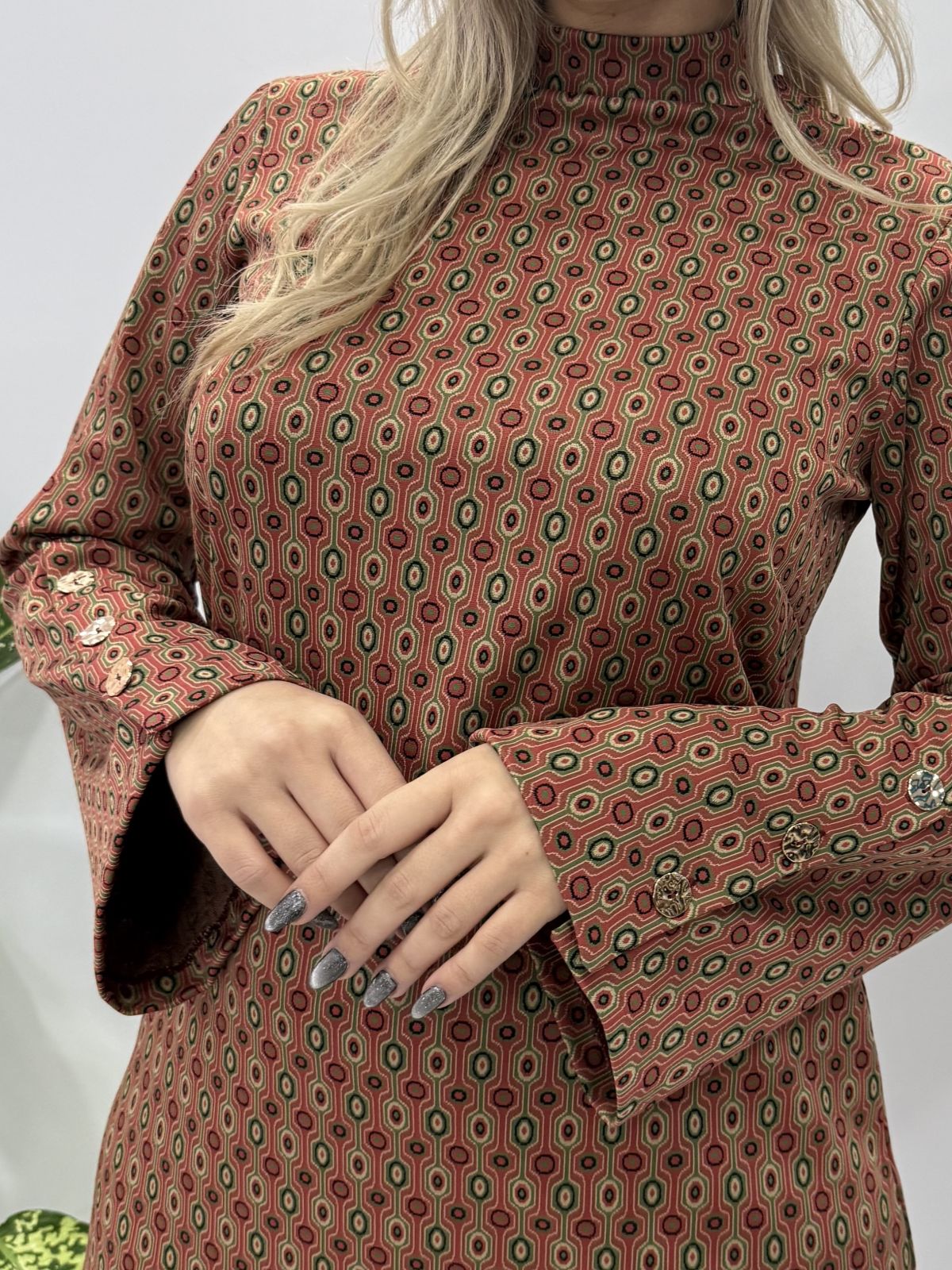 Φόρεμα punto εμπριμέ με καμπάνα μανίκι και χρυσά κουμπιά πορτοκαλί