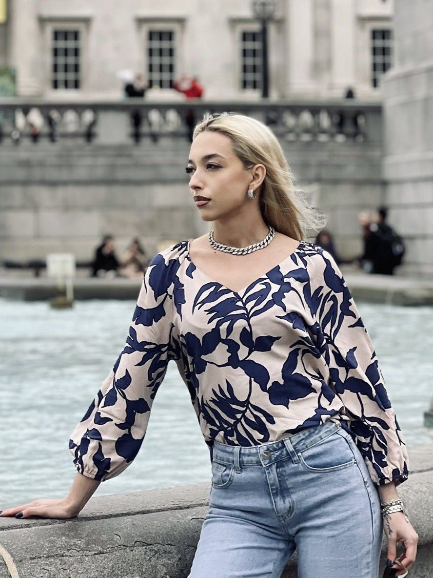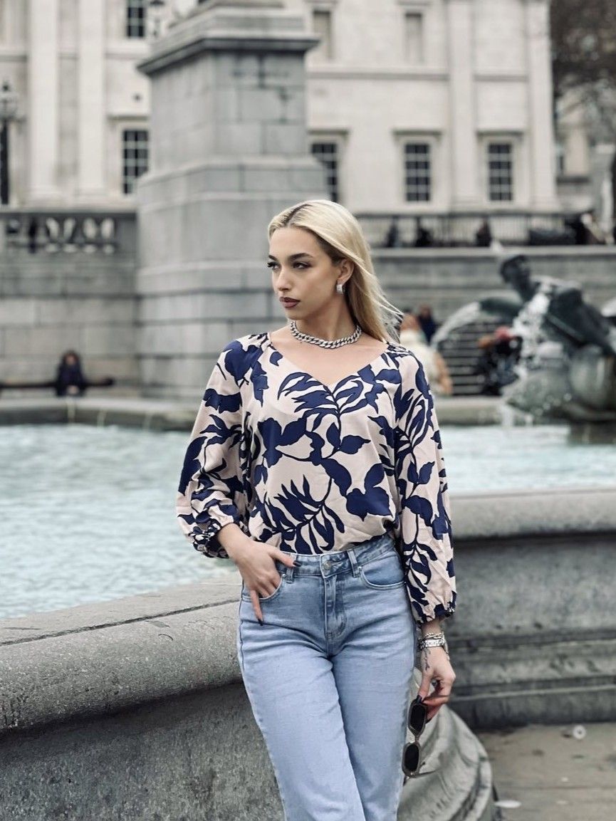 Μπλούζα εμπριμέ με V και λάστιχο στα μανίκια μπλε