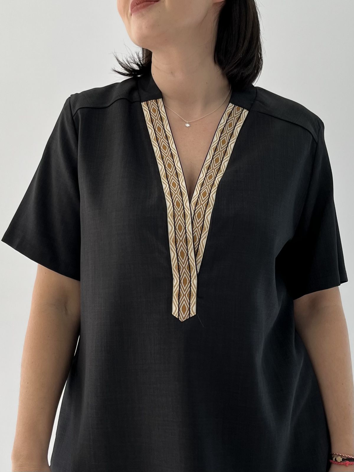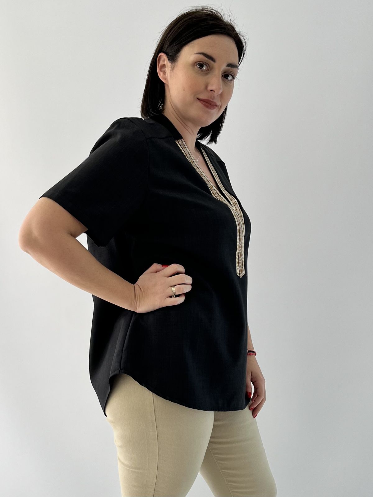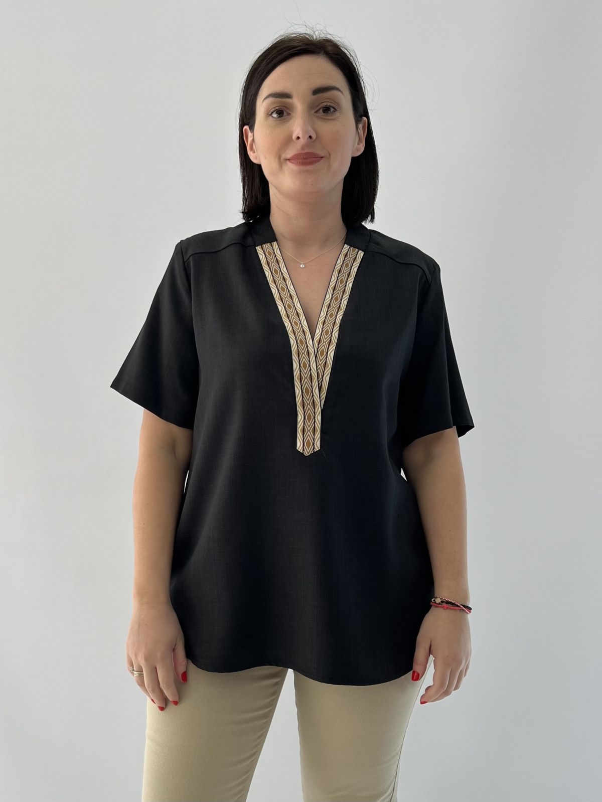 Πουκαμίσα λινή με κέντημα στο V μαύρο