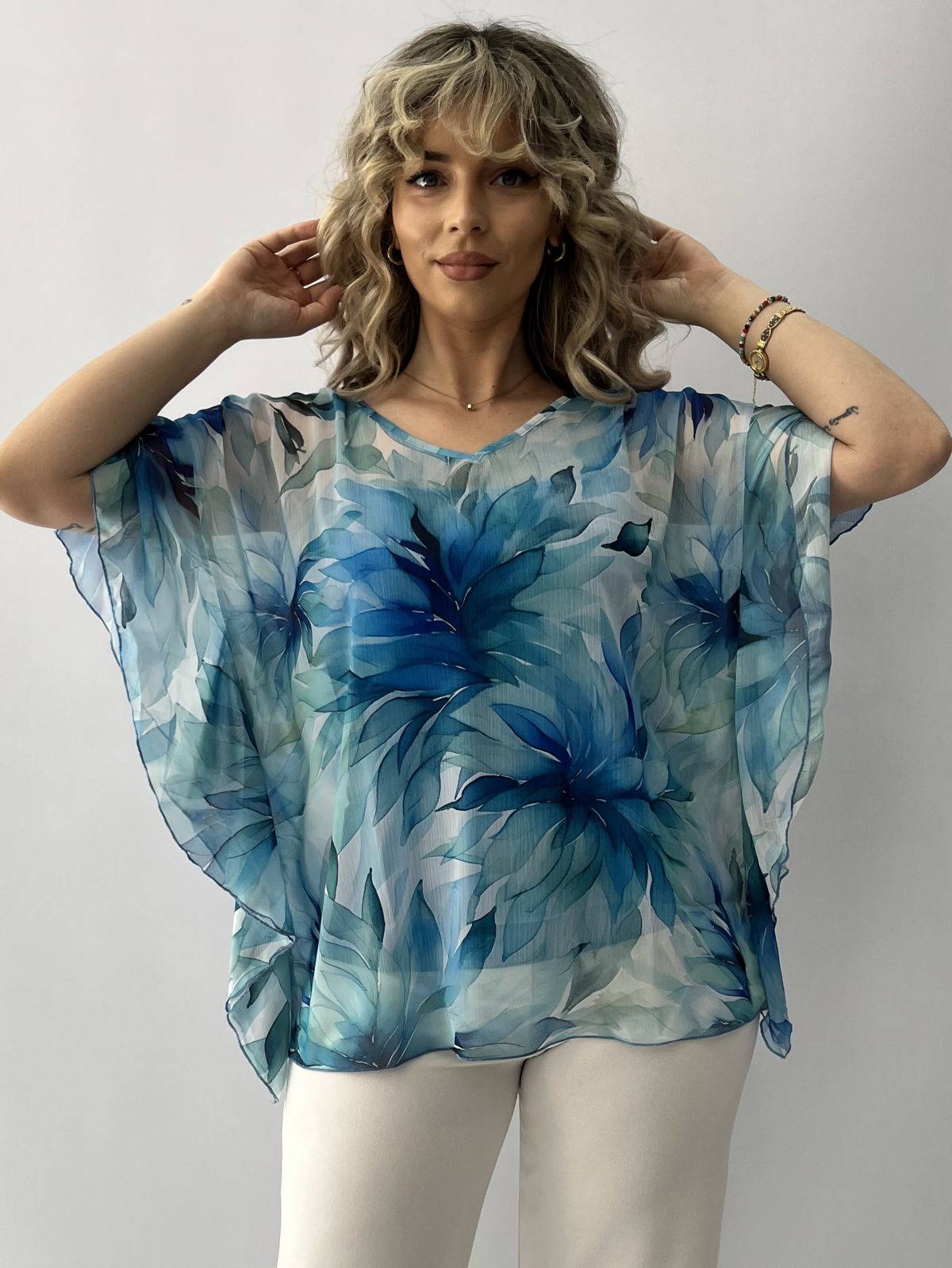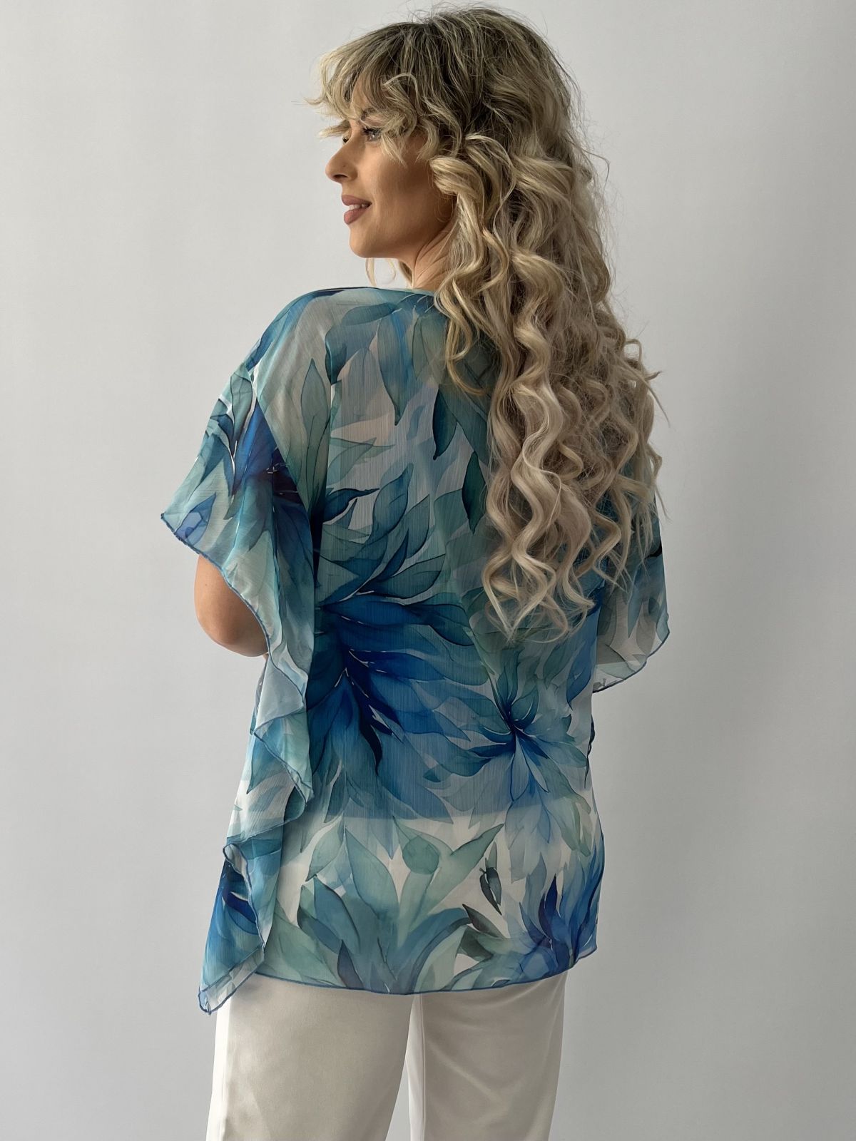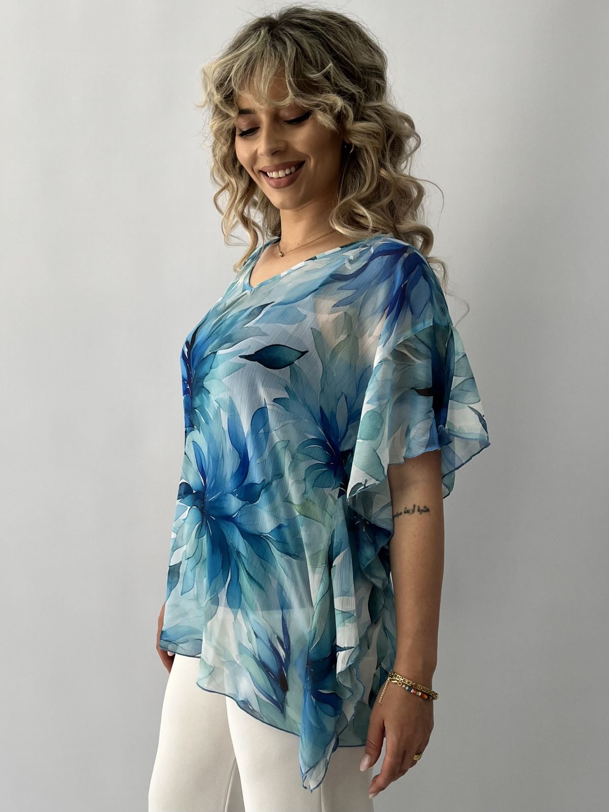 Πουκαμίσα εμπριμέ μουσελίνα με βολάν στο μανίκι και τοπ μπλε