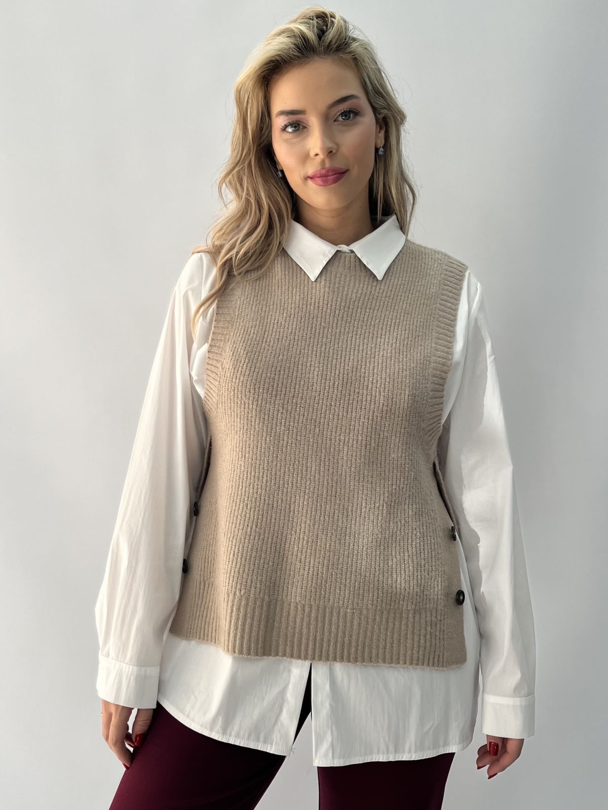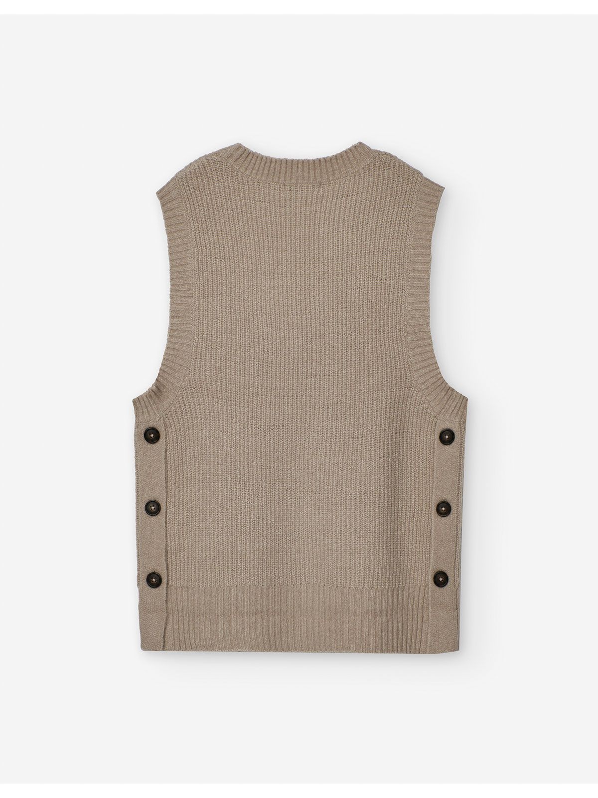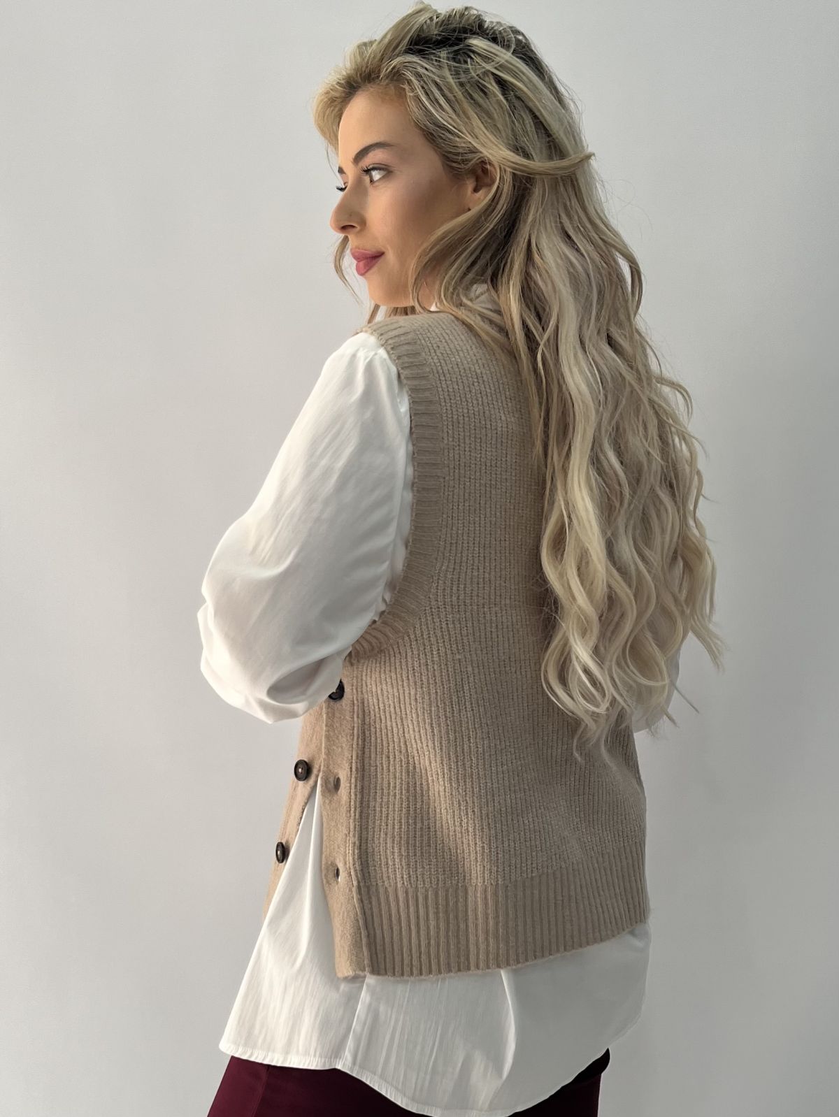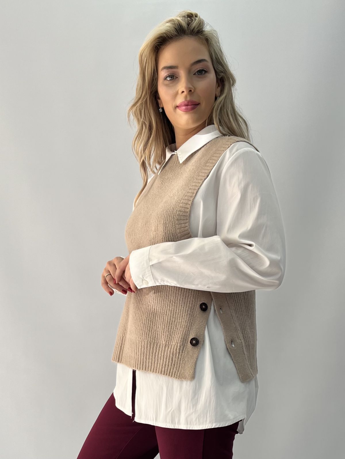 Γιλέκο πλεκτό με πατηλέτα και κουμπιά στο πλάι μπεζ