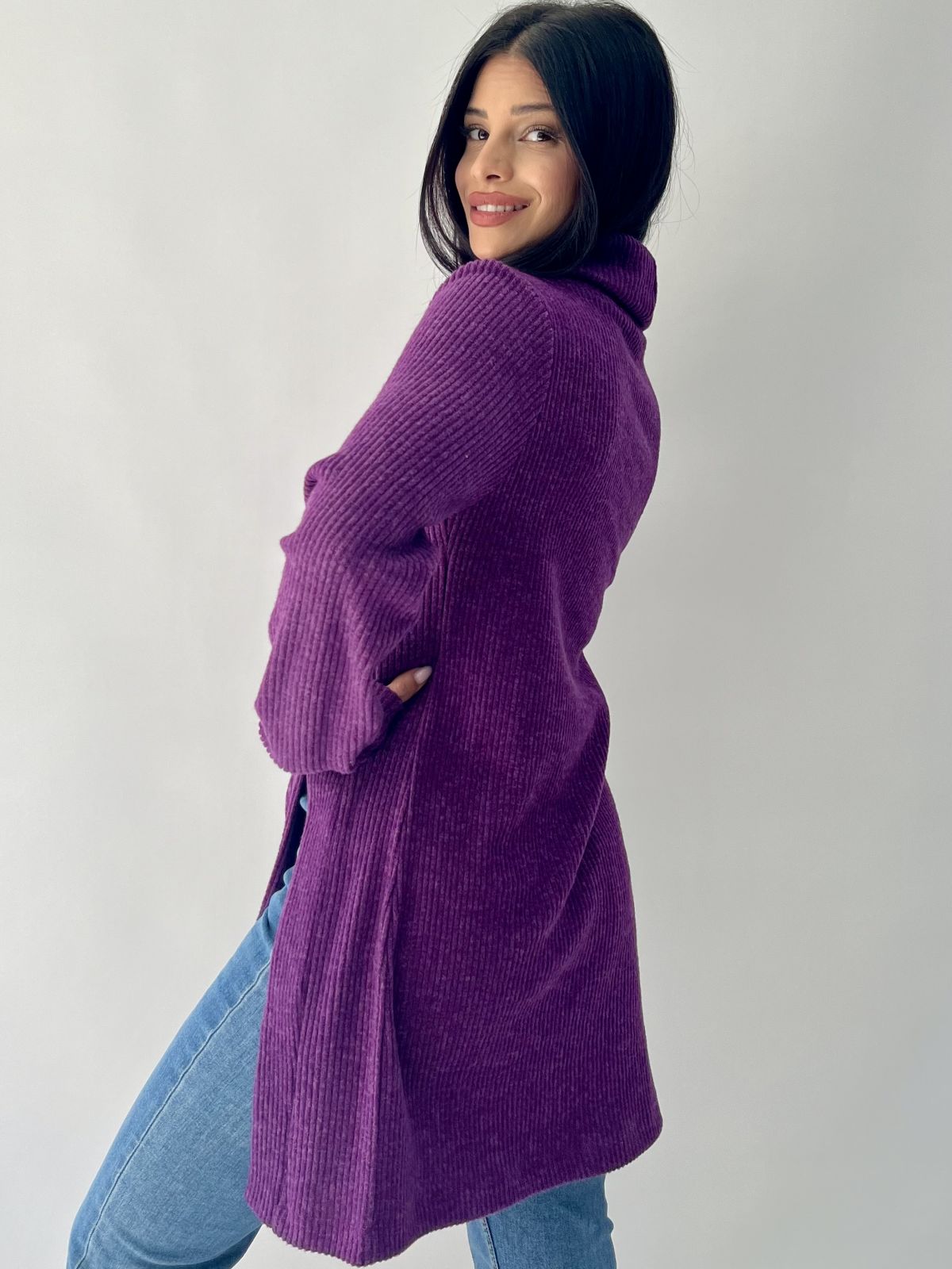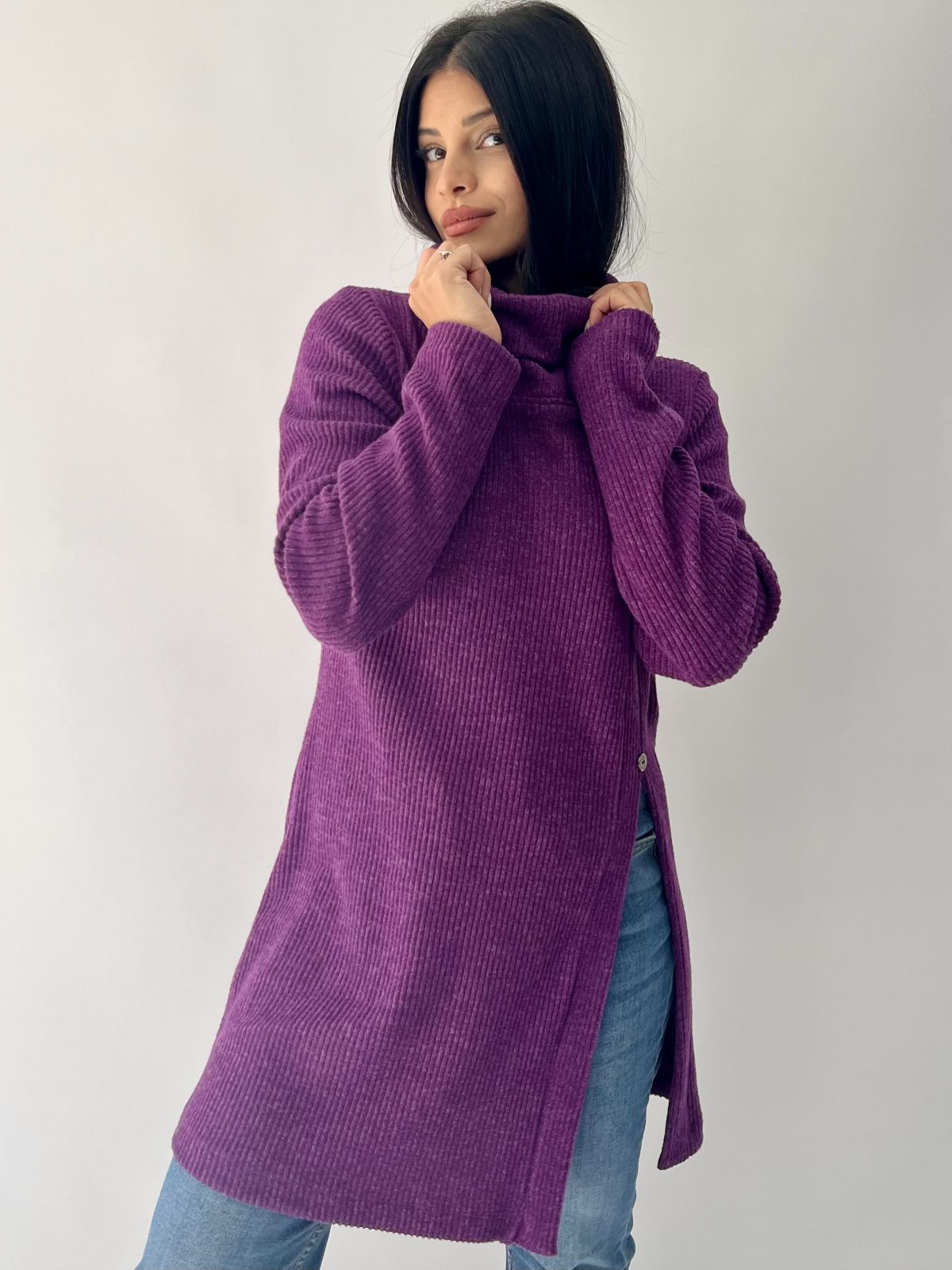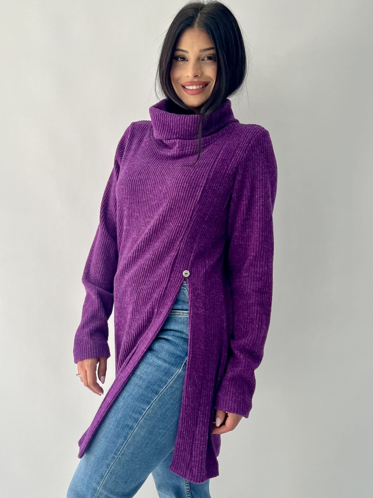 Μπλούζα πλεκτή με γιακά, κουμπί και άνοιγμα στο πλάι μωβ