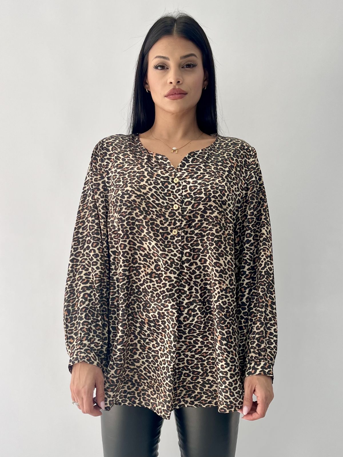 Πουκαμίσα σατέν animal print με χρυσά κουμπιά καφέ