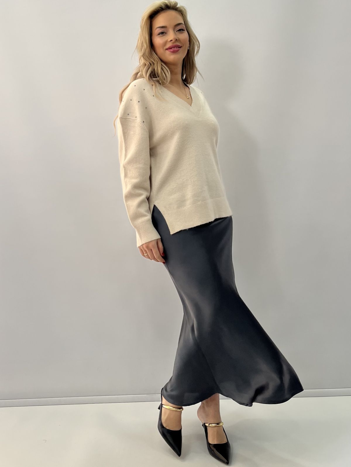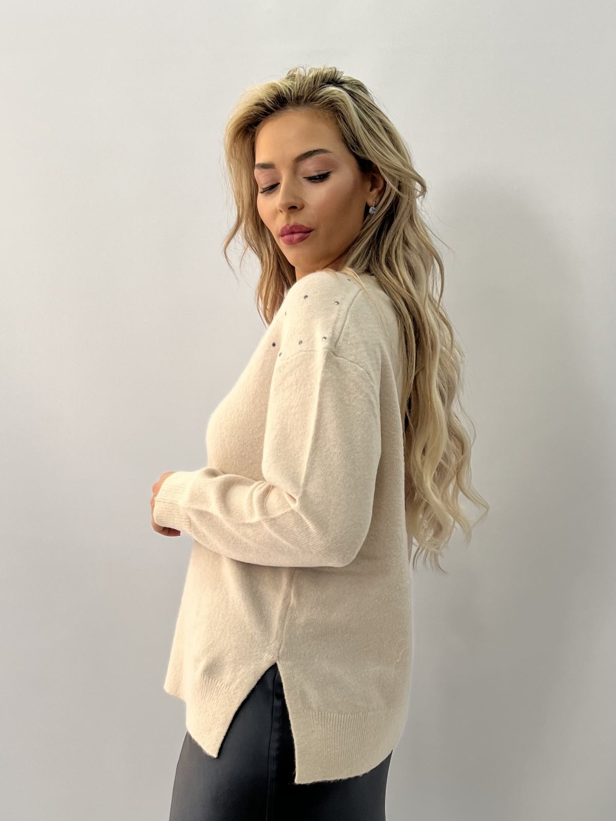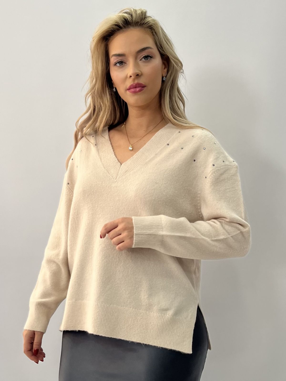 Μπλούζα μπλεχτή με V και στρας εκρού