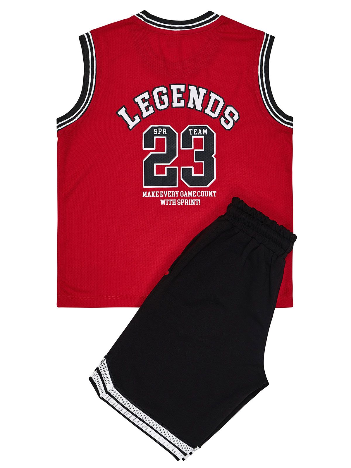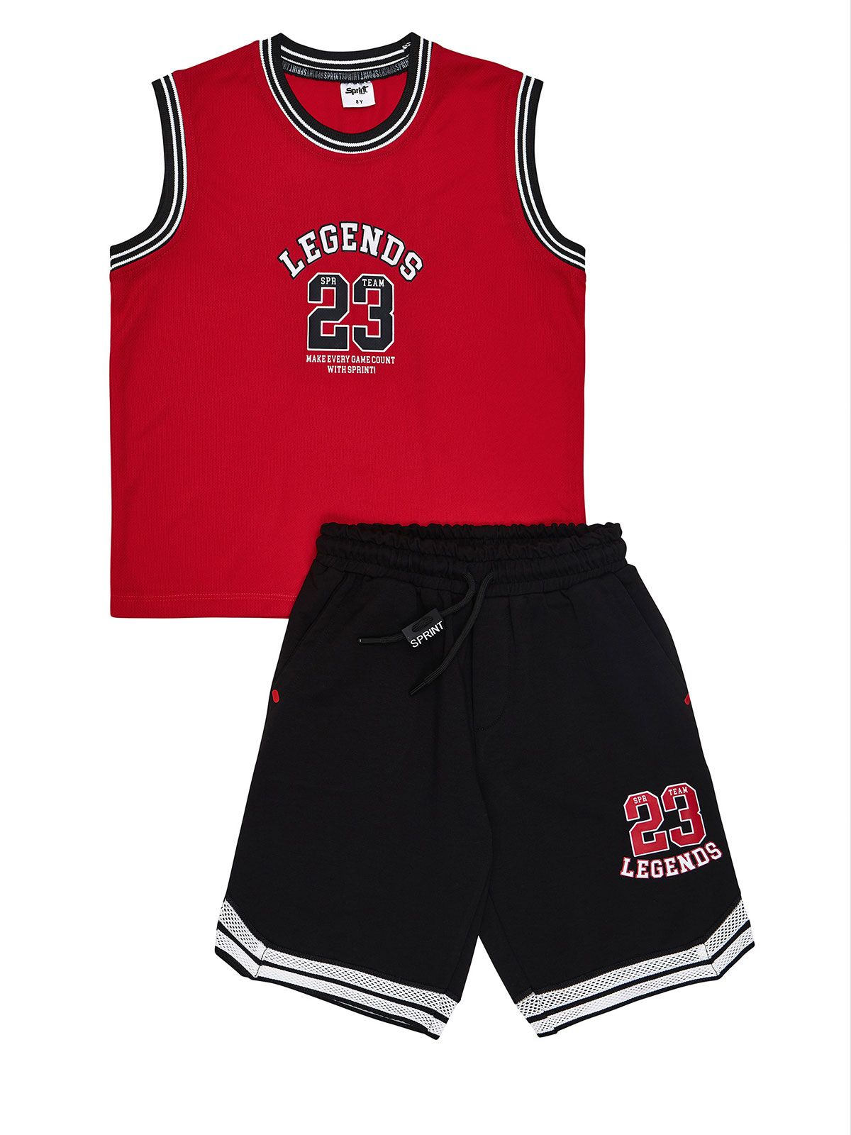 Σετ μπλούζα αμάνικη με print basketball και βερμούδα με λεπτομέρειες κόκκινο