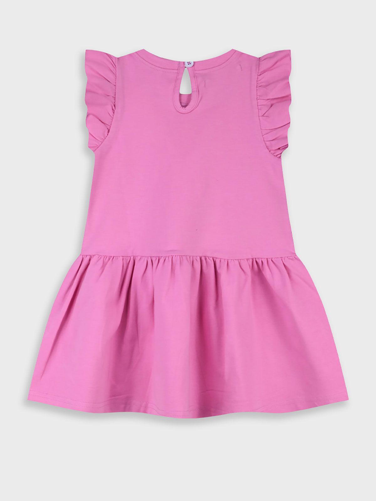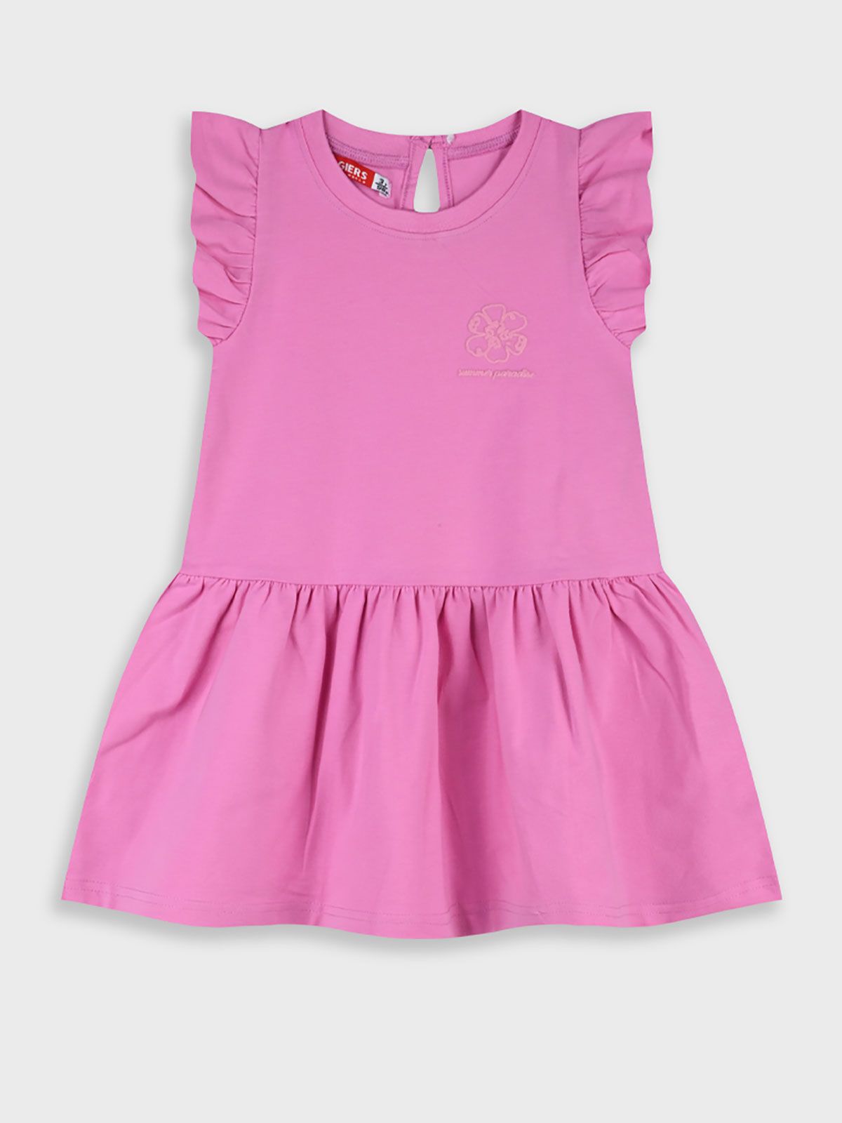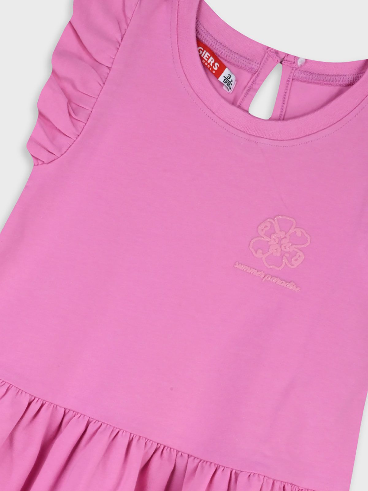 Φόρεμα μονόχρωμο με βολάν και print Summer paradise φούξια