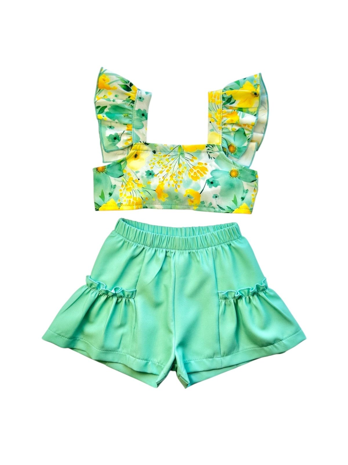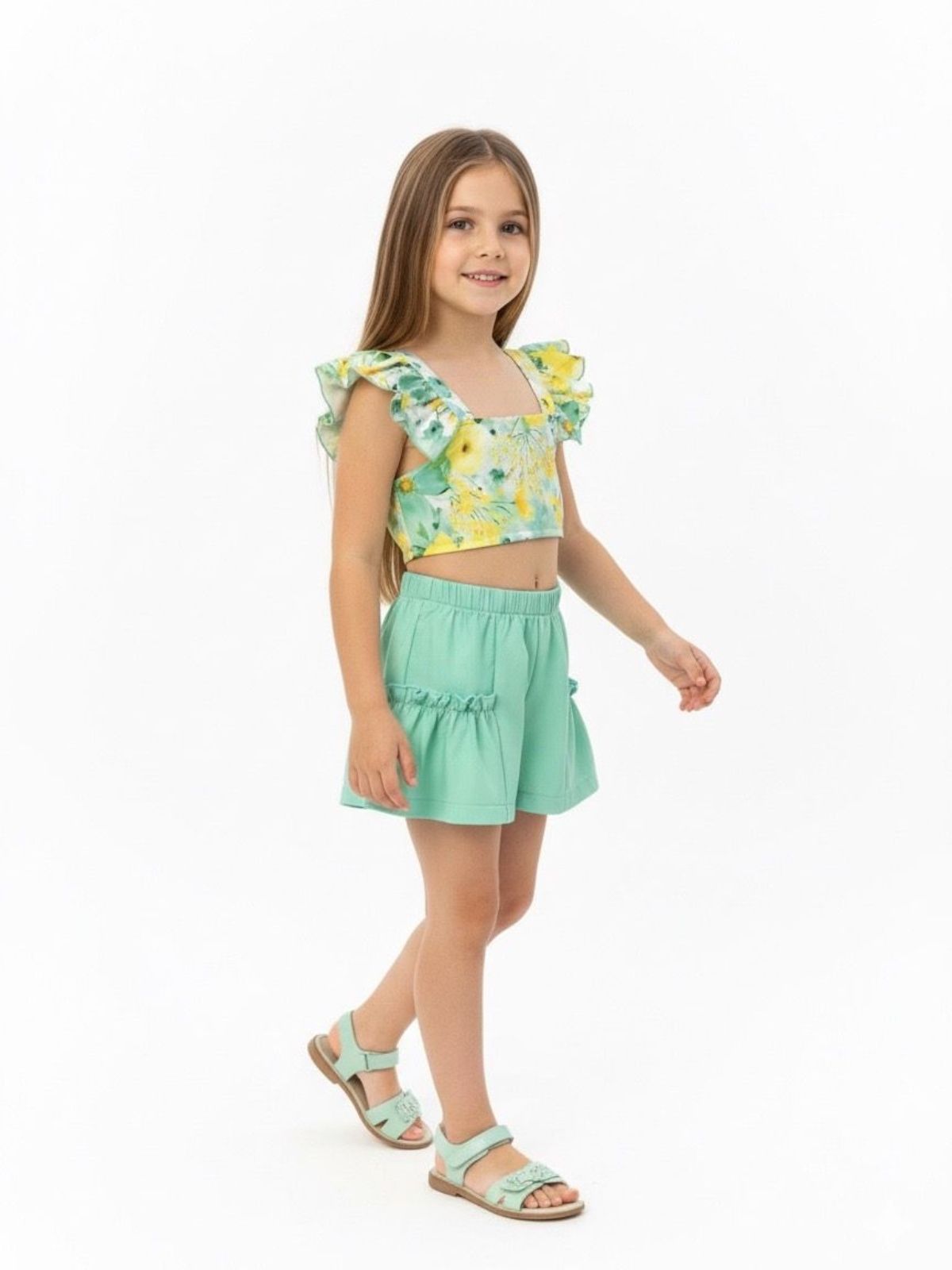 Σετ κροπ τοπ φλοράλ και μονόχρωμο σορτς με βολάν μέντα