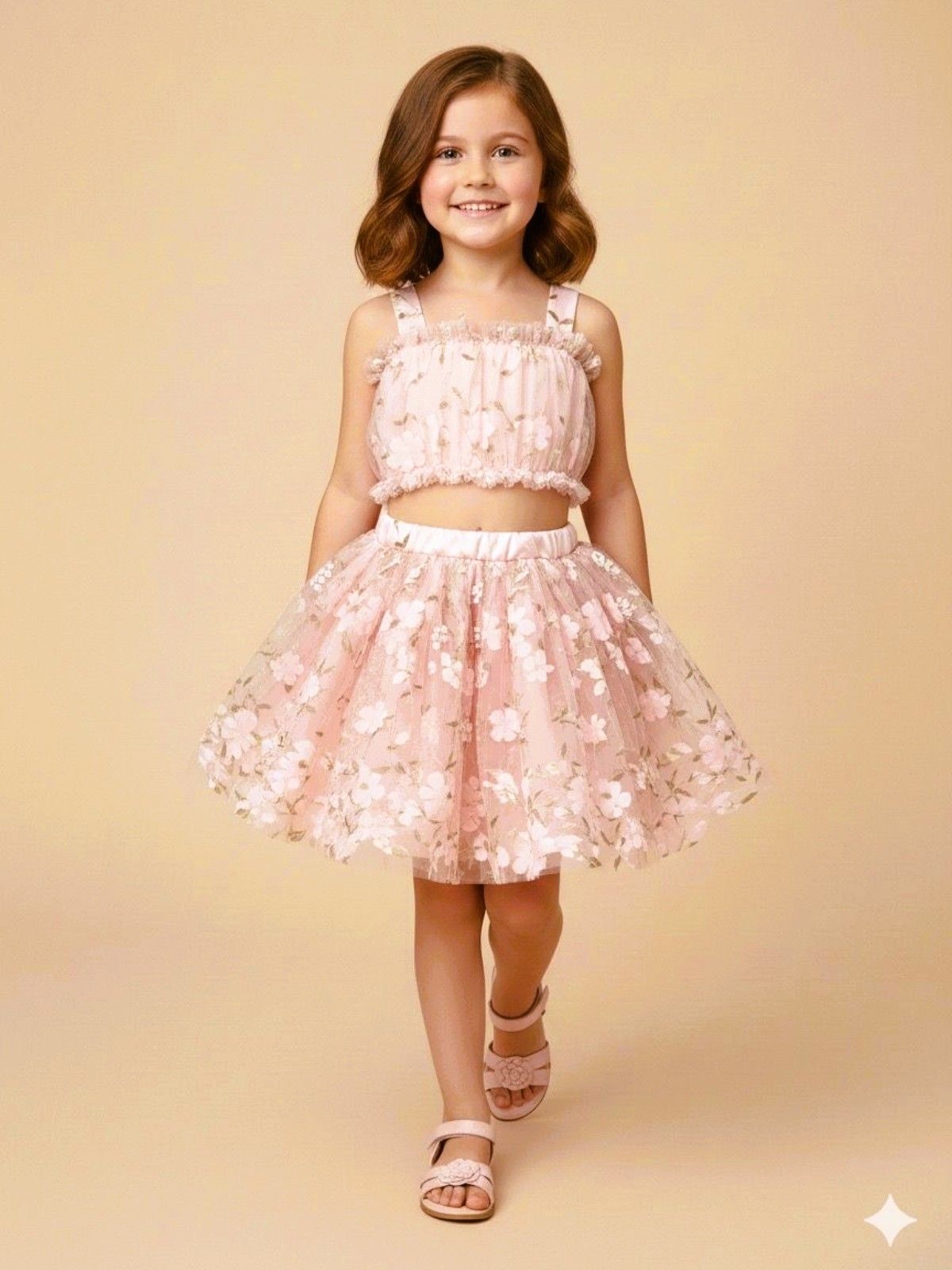 Σετ τοπ και φούστα με τούλι και 3D λουλούδια κρεμ