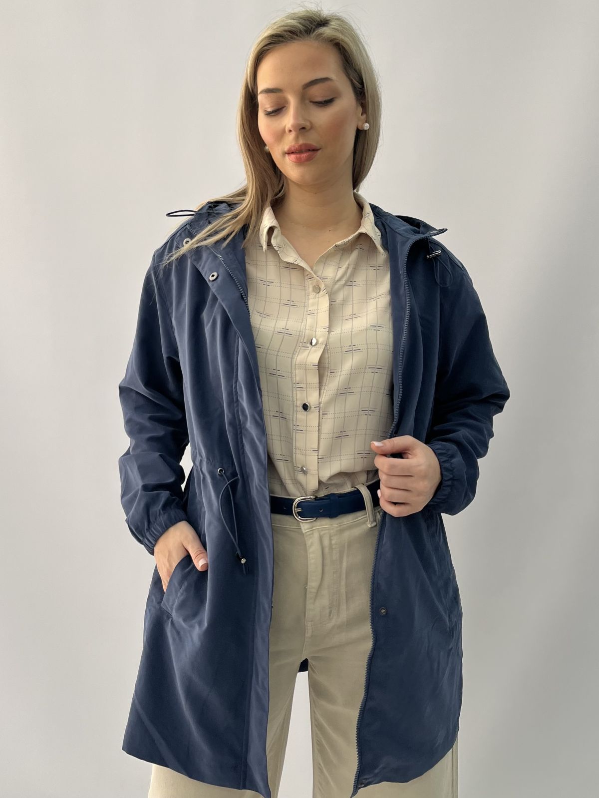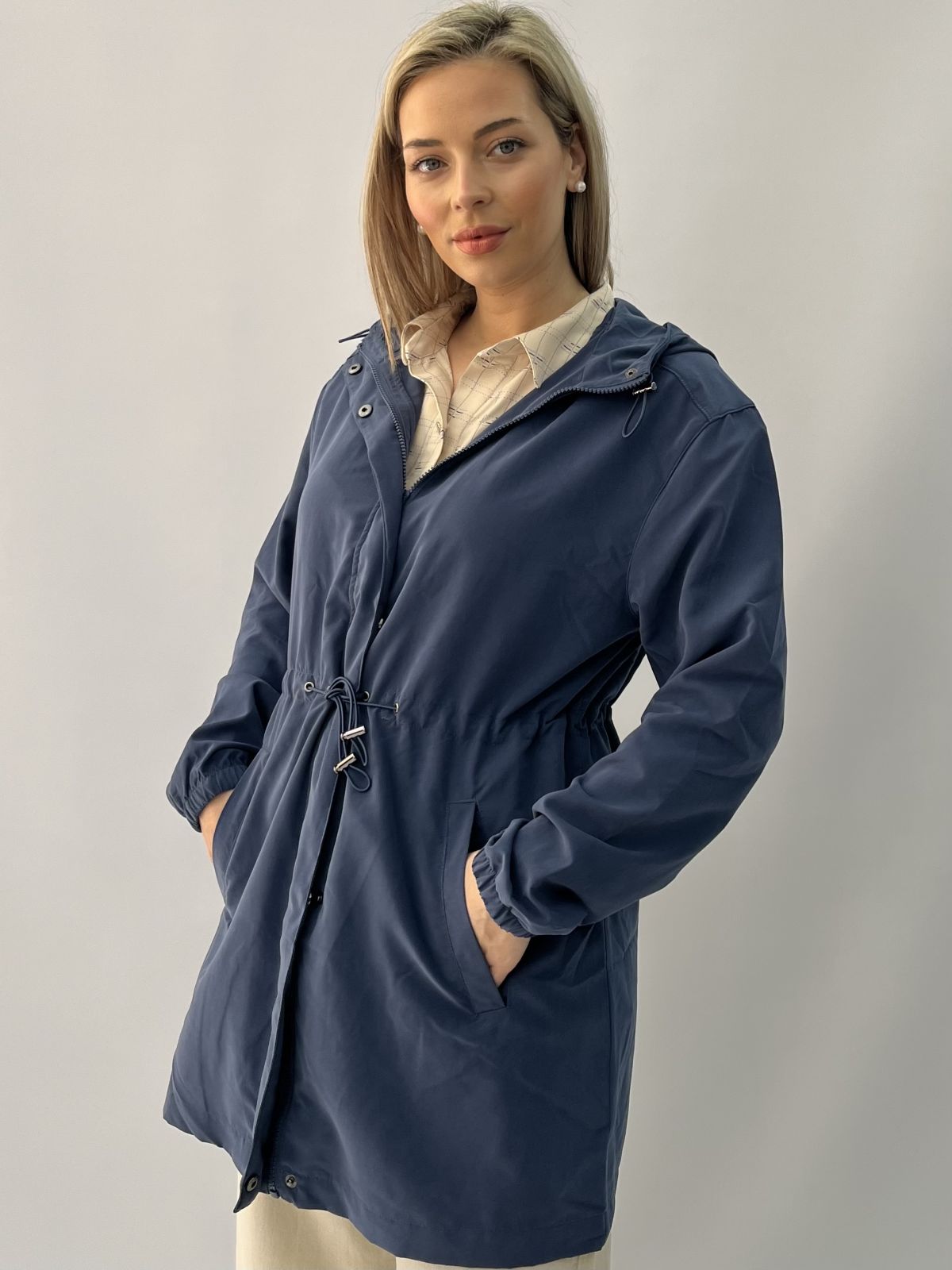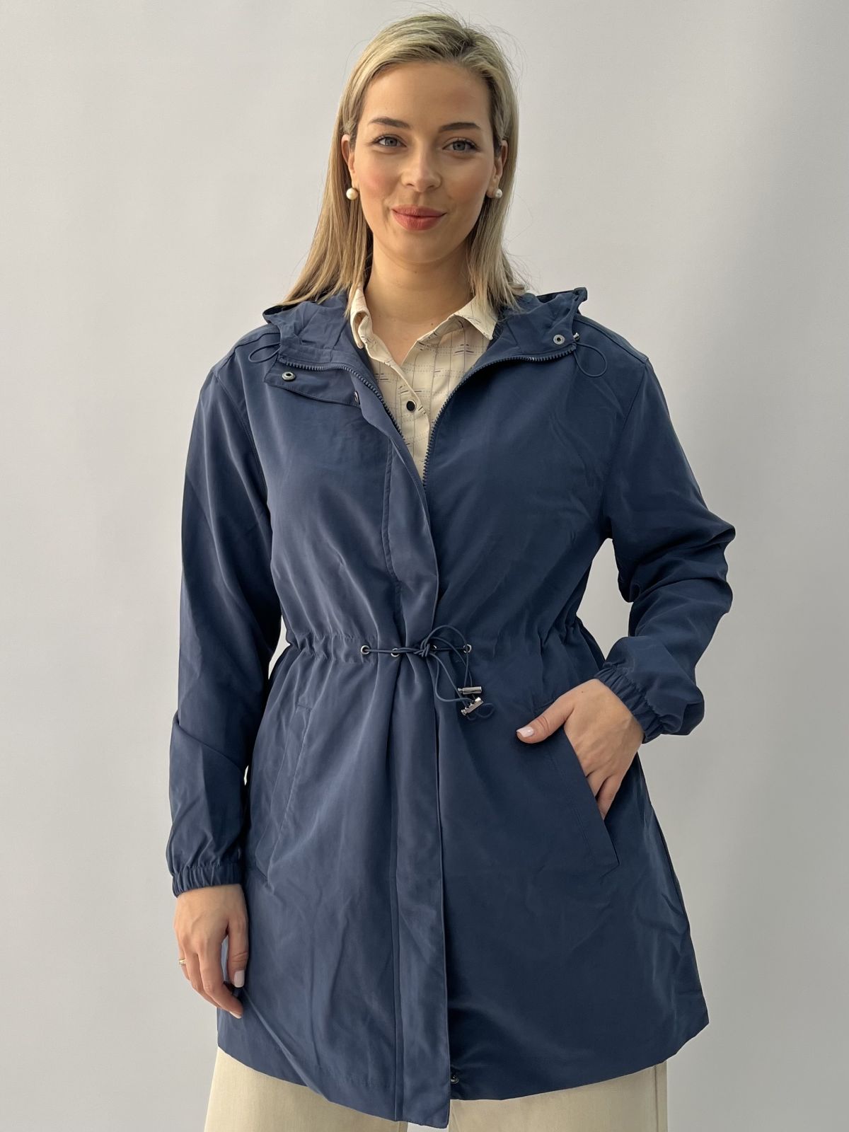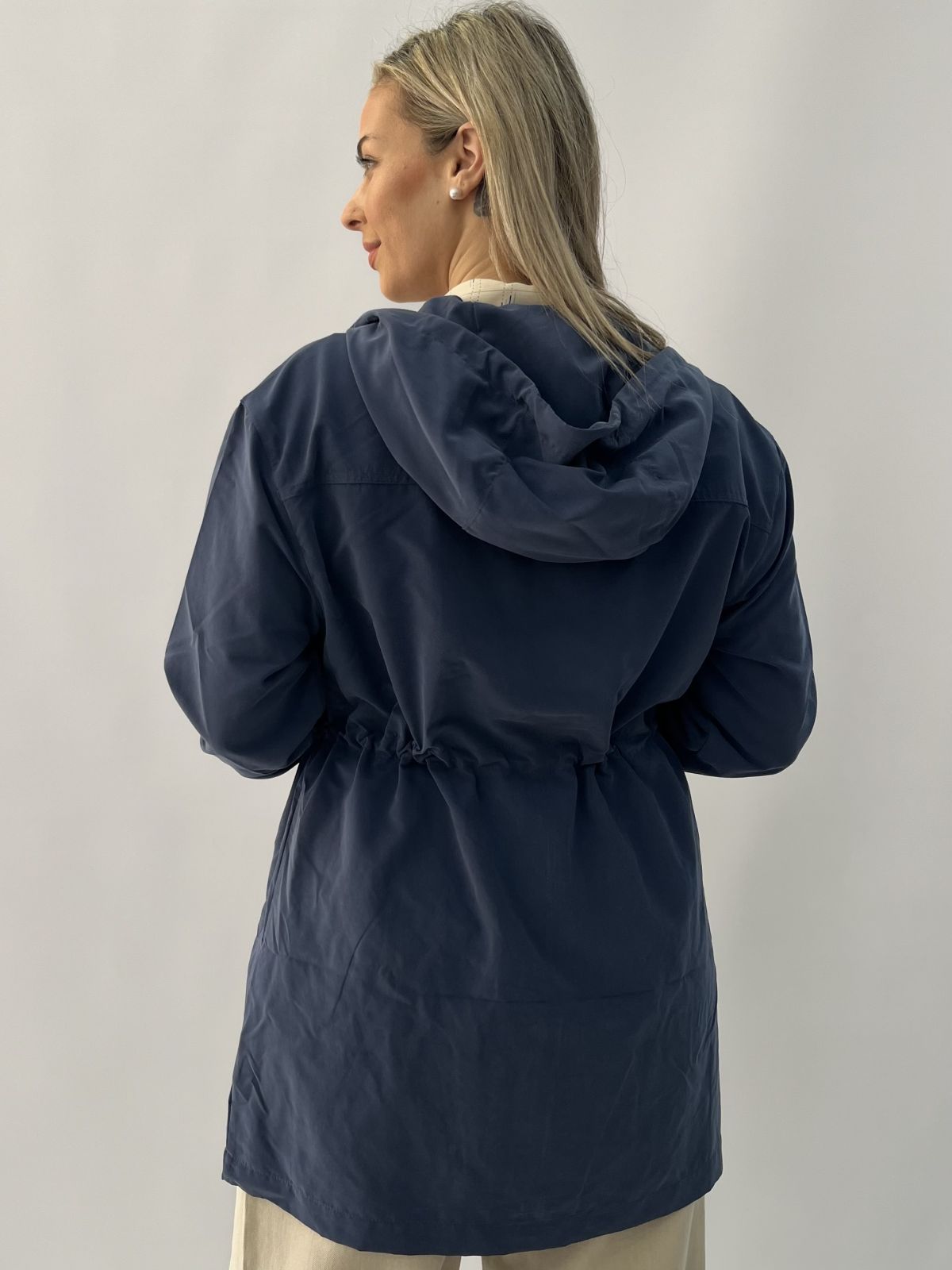 Τζάκετ μακρύ με κουκούλα και λάστιχο στη μέση μπλε ραφ