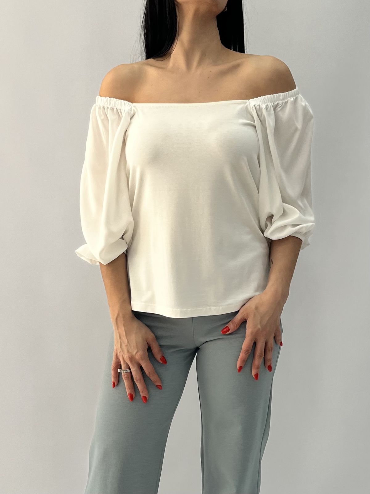 Μπλούζα off shoulder με σούρα στα μανίκια λευκό
